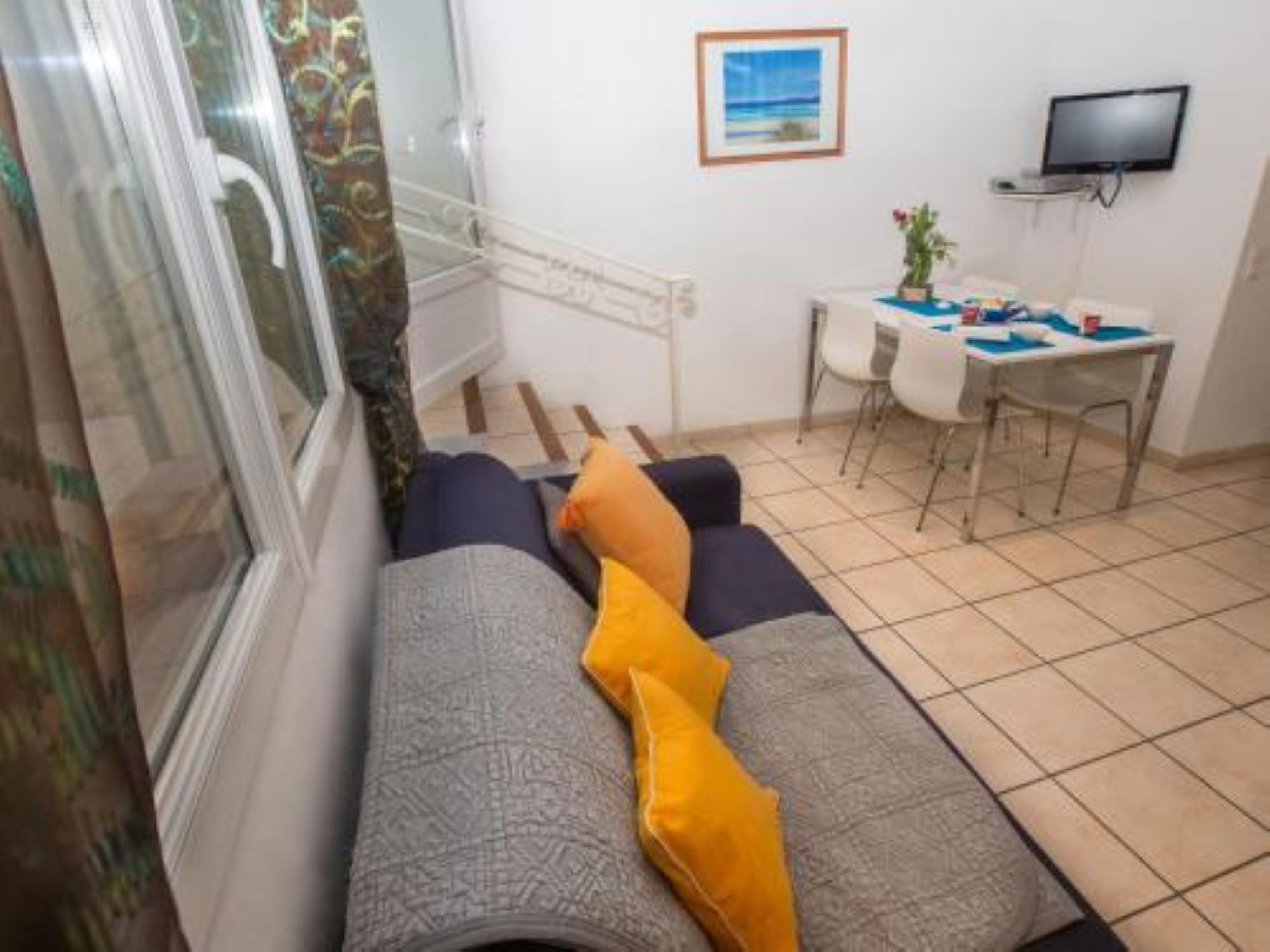 The bedroom offers comfortable sleeping arrangements for two guests, while additional sleeping space is available in the living area for two more guests, making this apartment ideal for small families or groups.
