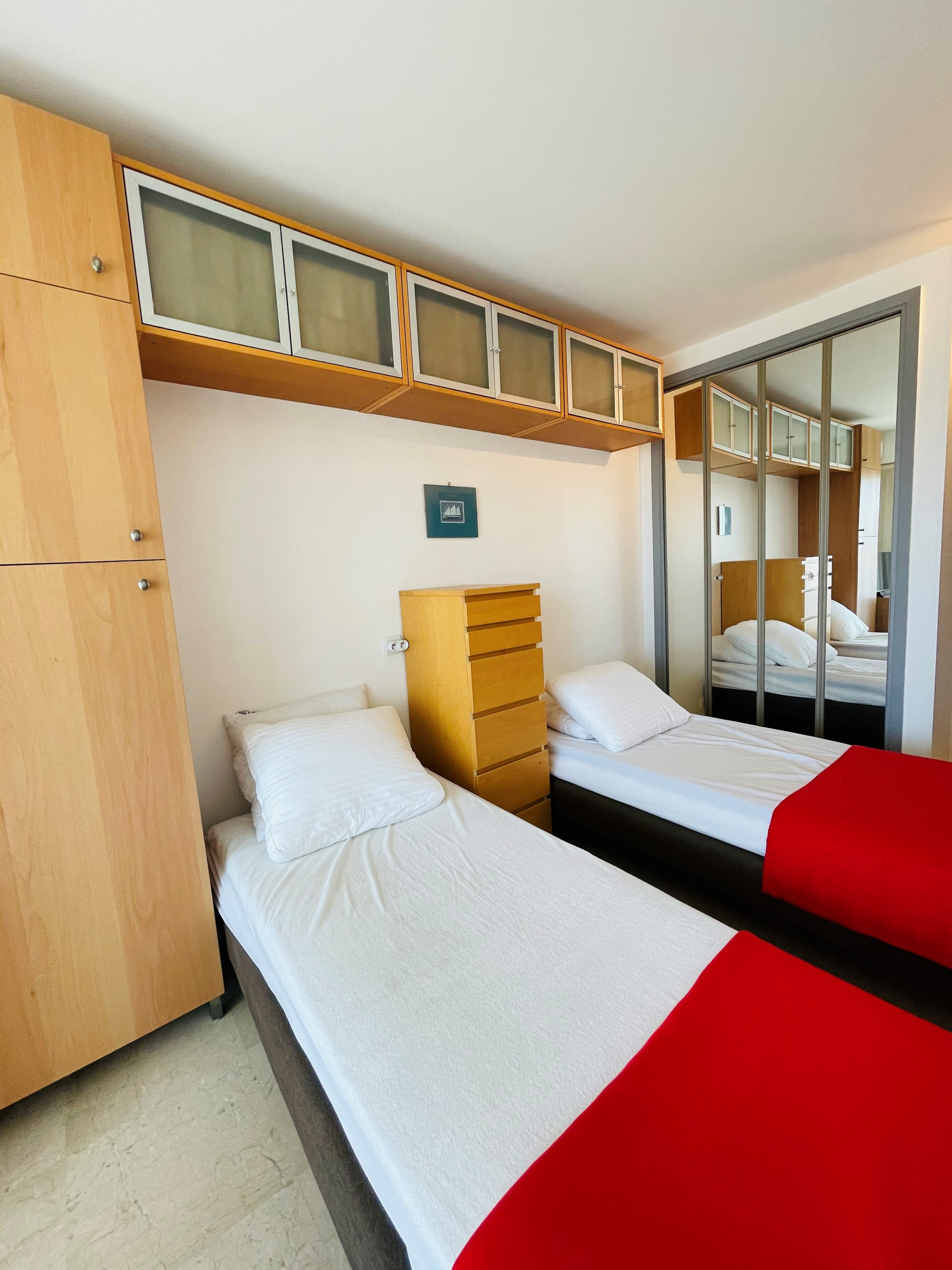 Upon entering, you'll discover a separate room divided by a sliding door, creating a welcoming sleeping area equipped with two beds for peaceful nights. The well-lit living space includes a sofa bed, a television, and a fully equipped open-plan kitchen. The kitchen features an electric stove, a refrigerator, a freezer, a microwave, a conventional oven, a washing machine, a dishwasher, a coffee maker, a toaster, and a kettle, offering everything you need to prepare delicious meals.