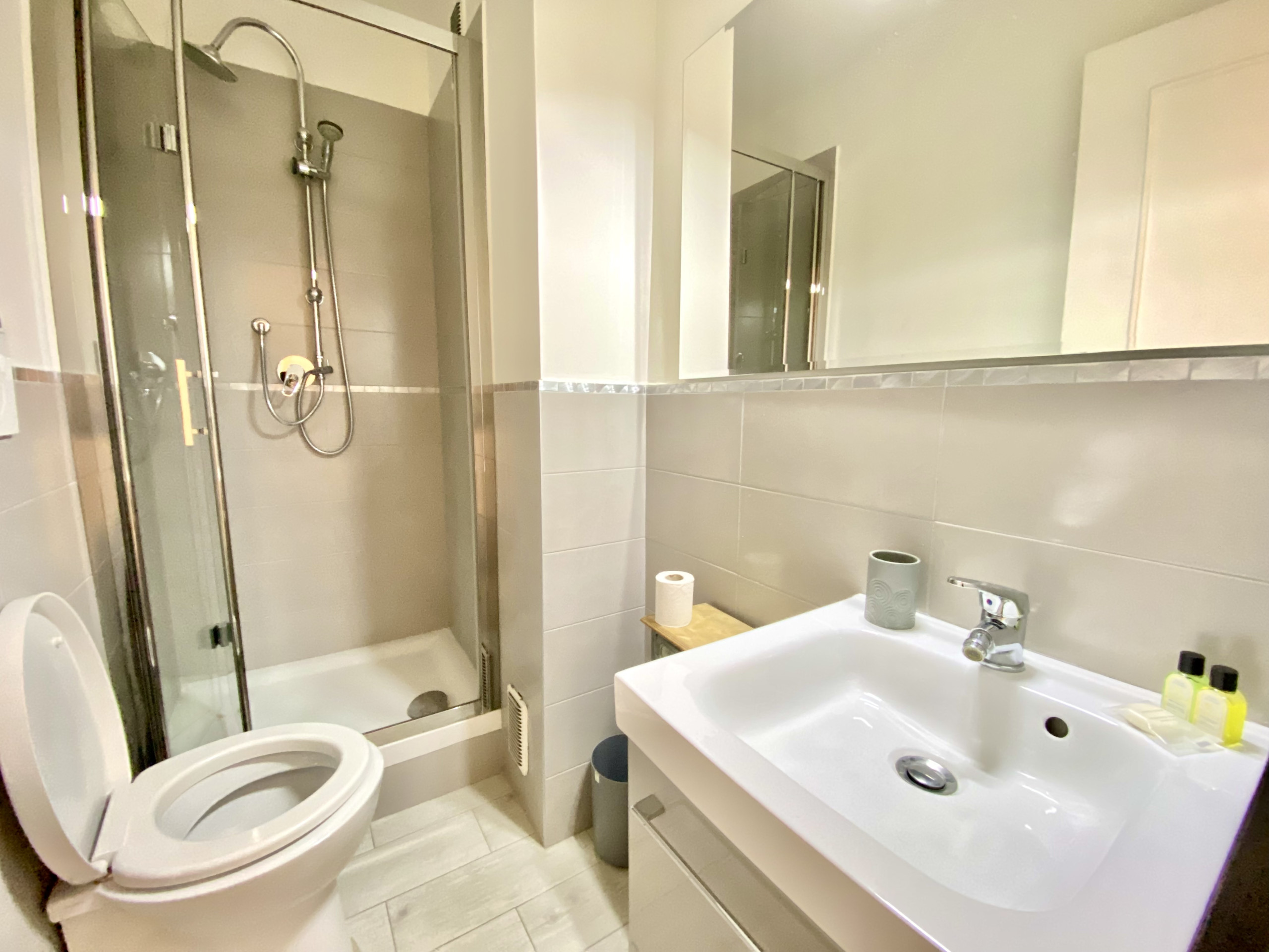 Bathroom: Refresh in the bathroom equipped with a shower.