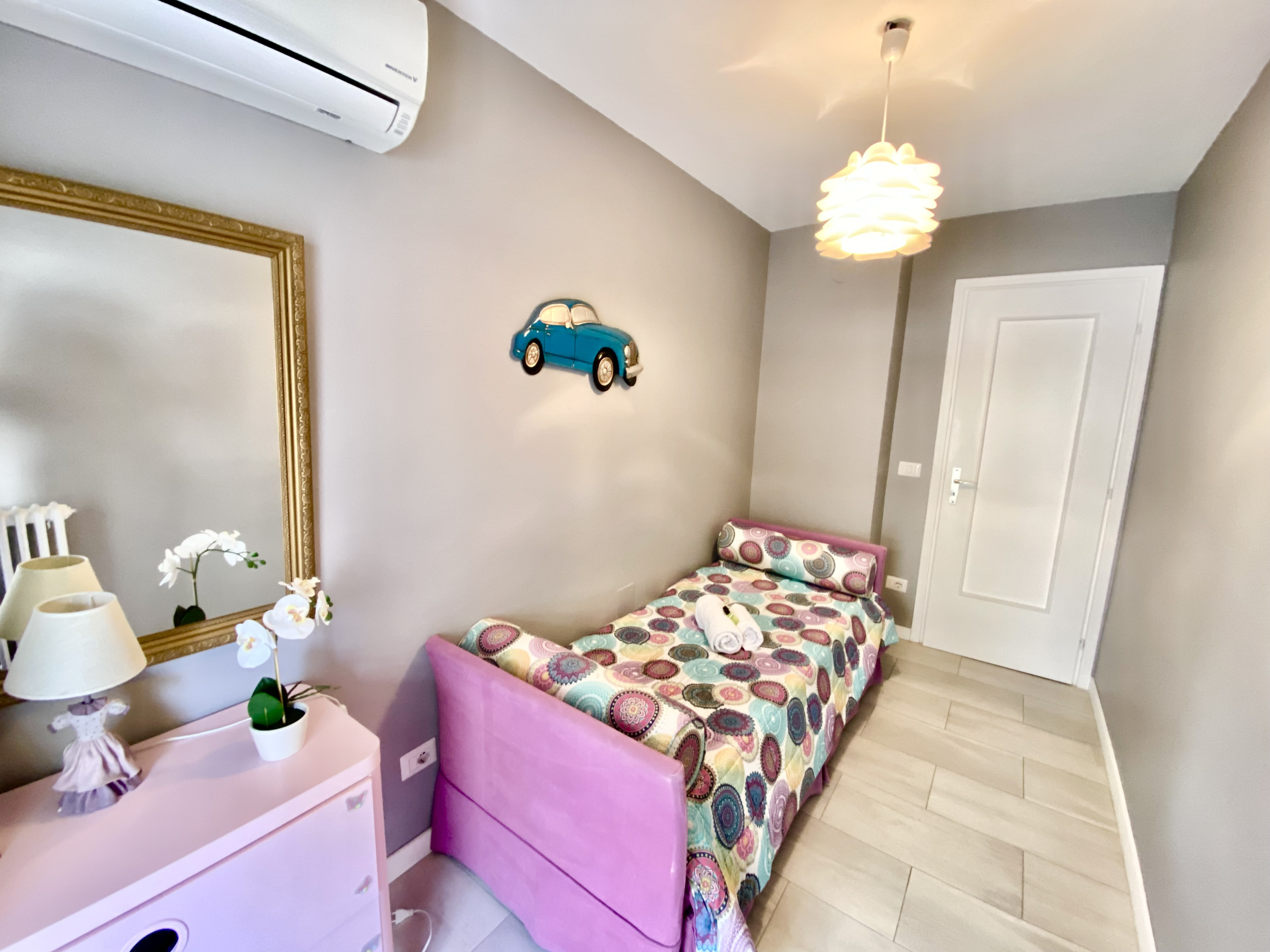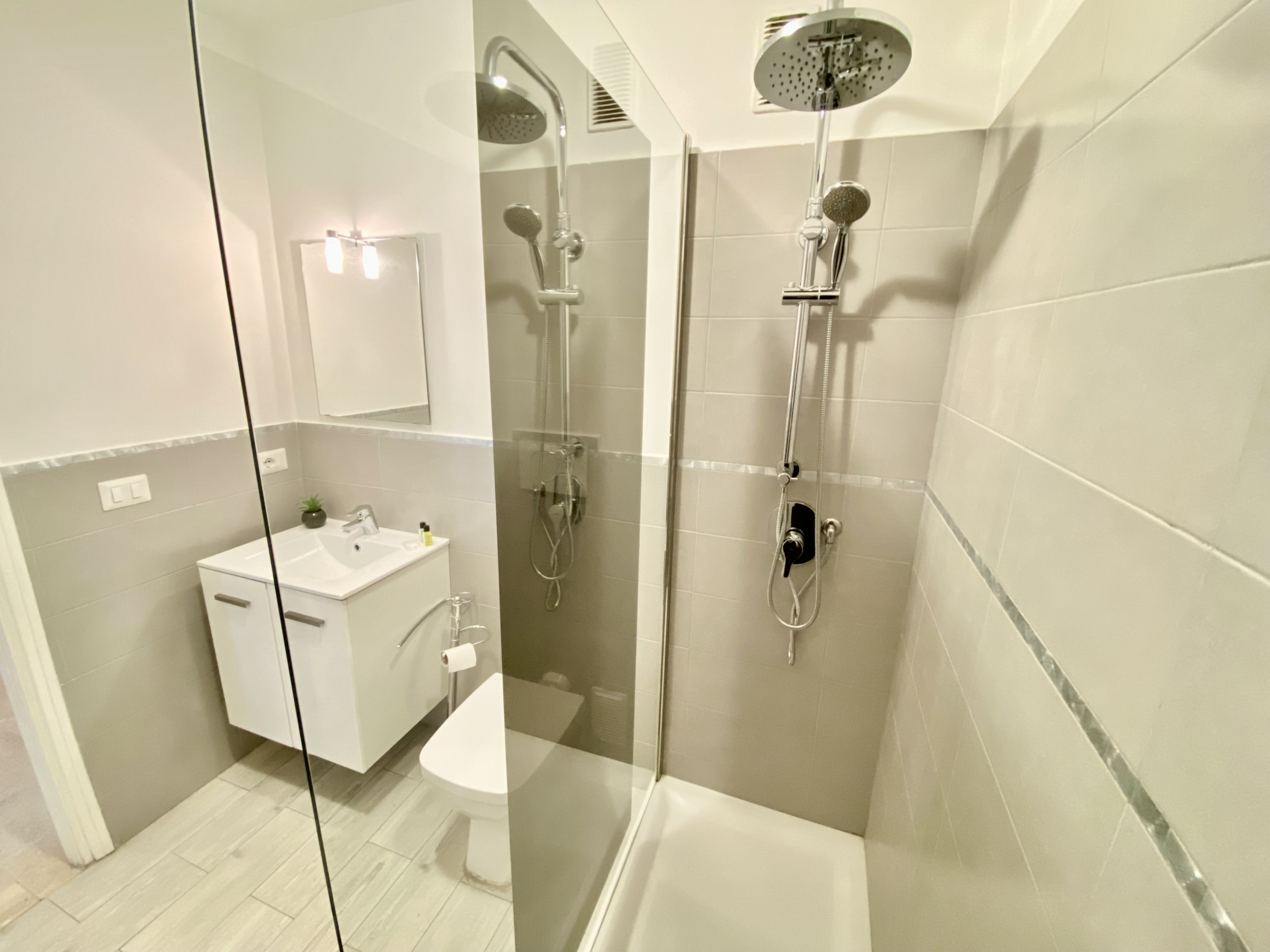 The apartment has 2 bedrooms and can accommodate up to 3 people. The two shower rooms with 2 toilets ensure additional comfort and privacy. A double bed for 2 people in one bedroom and a single bed for 1 adult in the other bedroom.