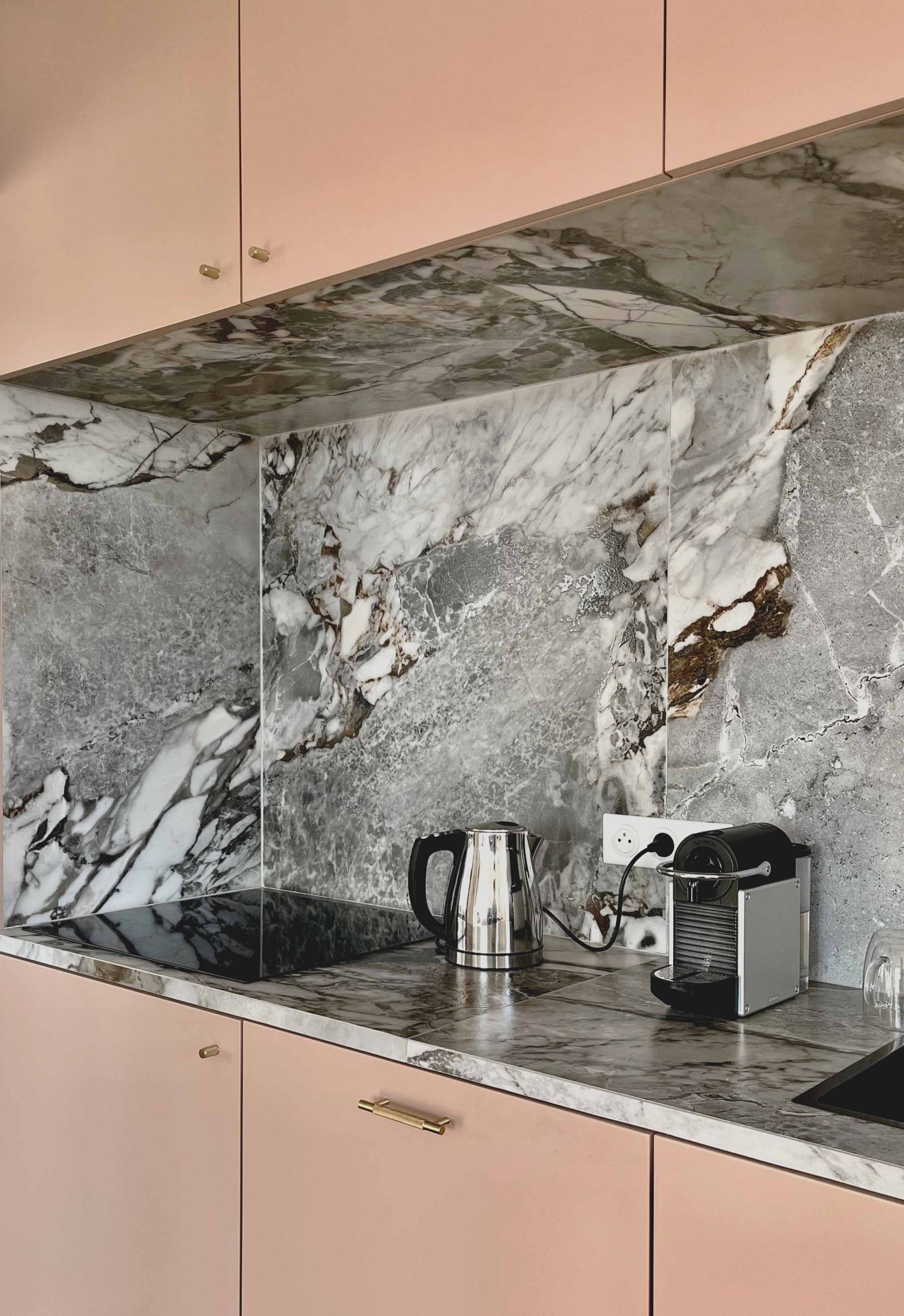 Kitchen with inductin cooker, refrigerator, dishwasher, dishes/cutlery, kitchen utensils, coffee machine, toaster and kettle.