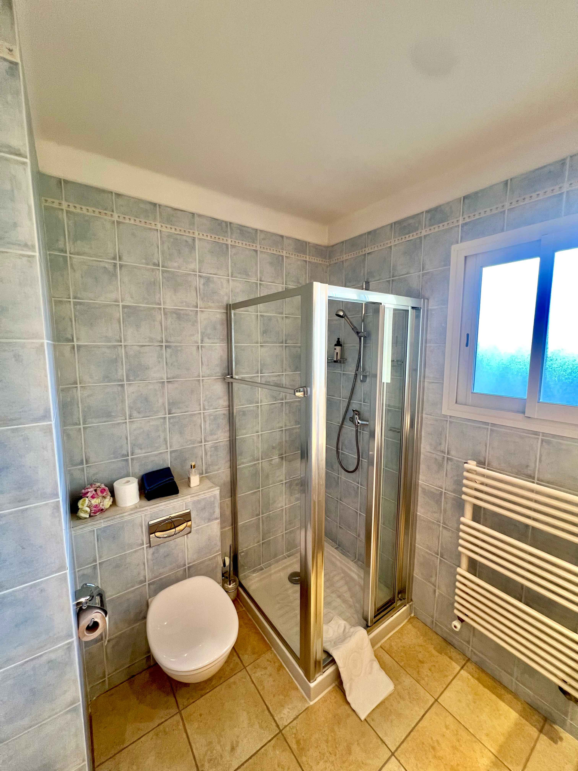 The bathroom is equipped with a shower and a hairdryer, and the toilet is separate for added convenience. The apartment benefits from air conditioning provided by the building, ensuring optimal comfort. A terrace with outdoor furniture offers a pleasant outdoor space to enjoy the Mediterranean climate. Iron and ironing table at disposal.