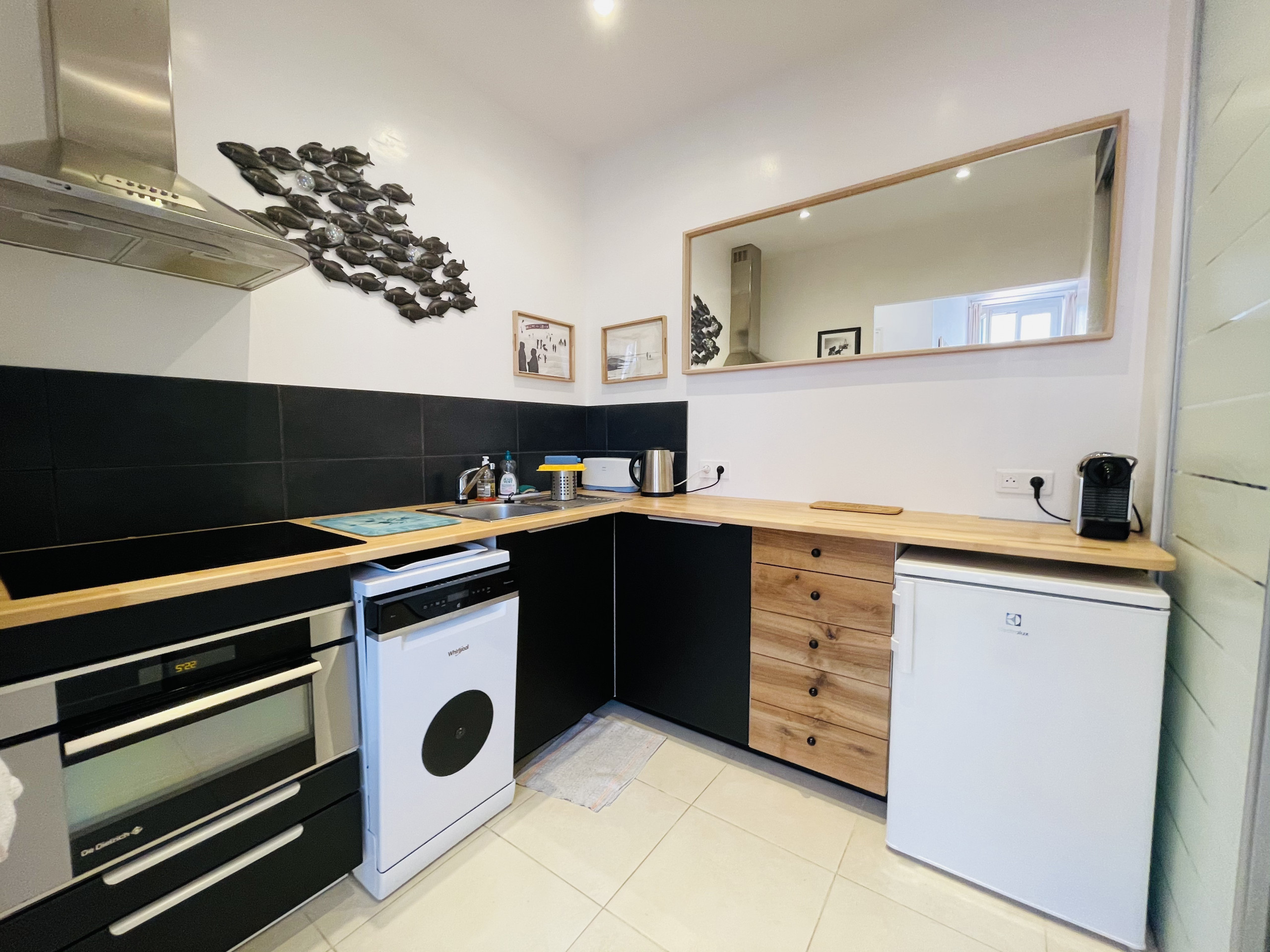 A very nice living room, a beautiful fully equipped kitchen