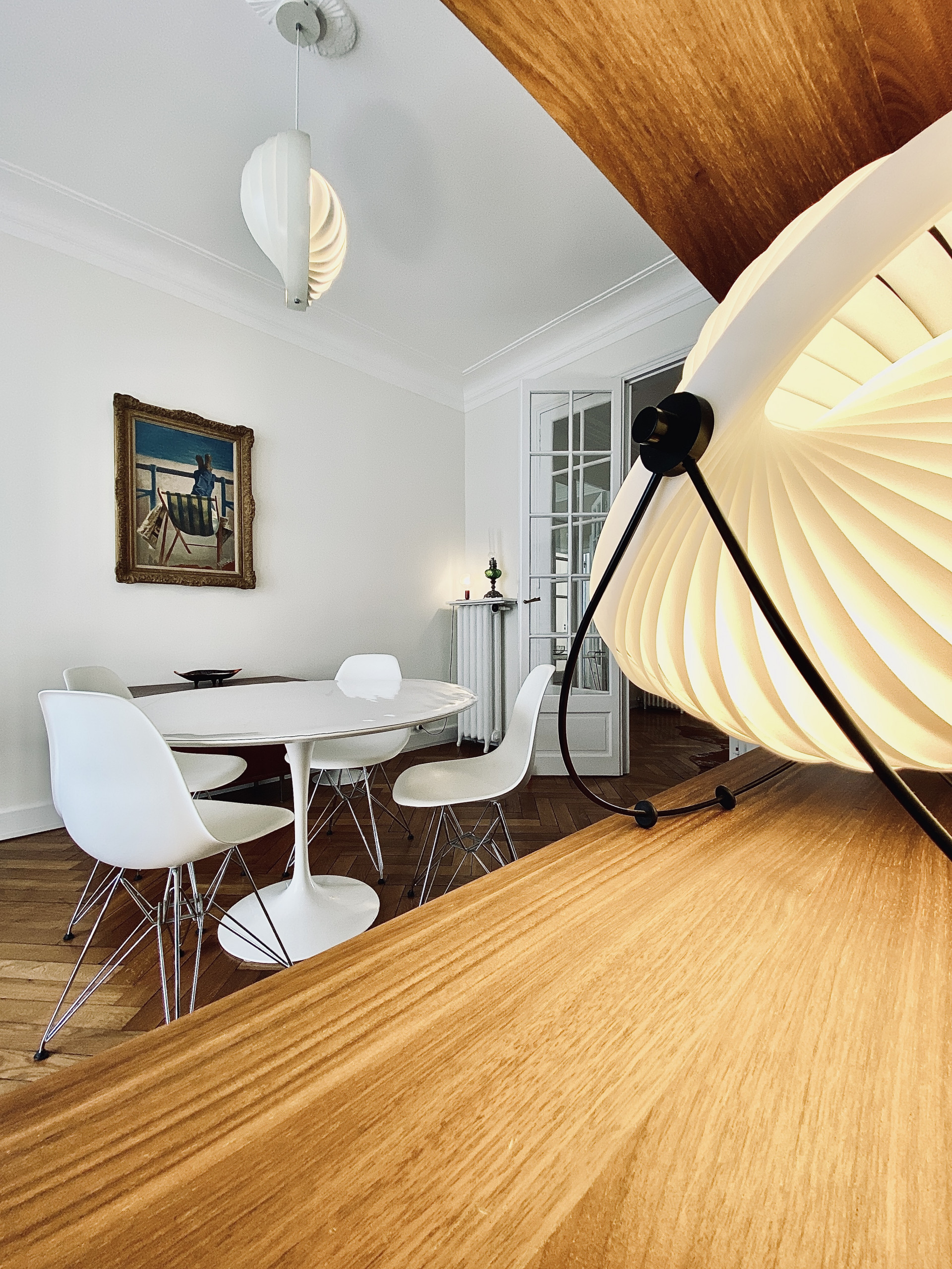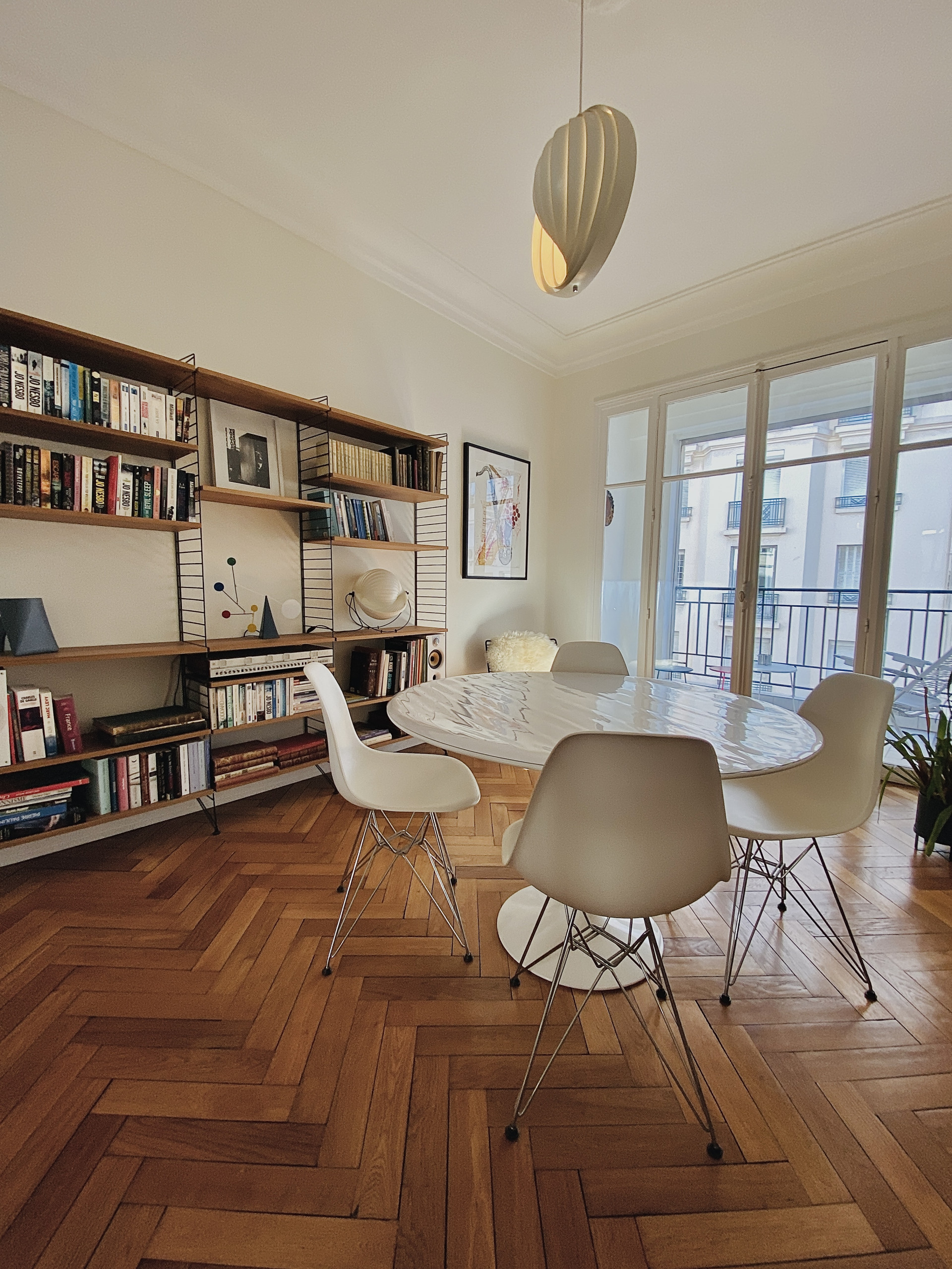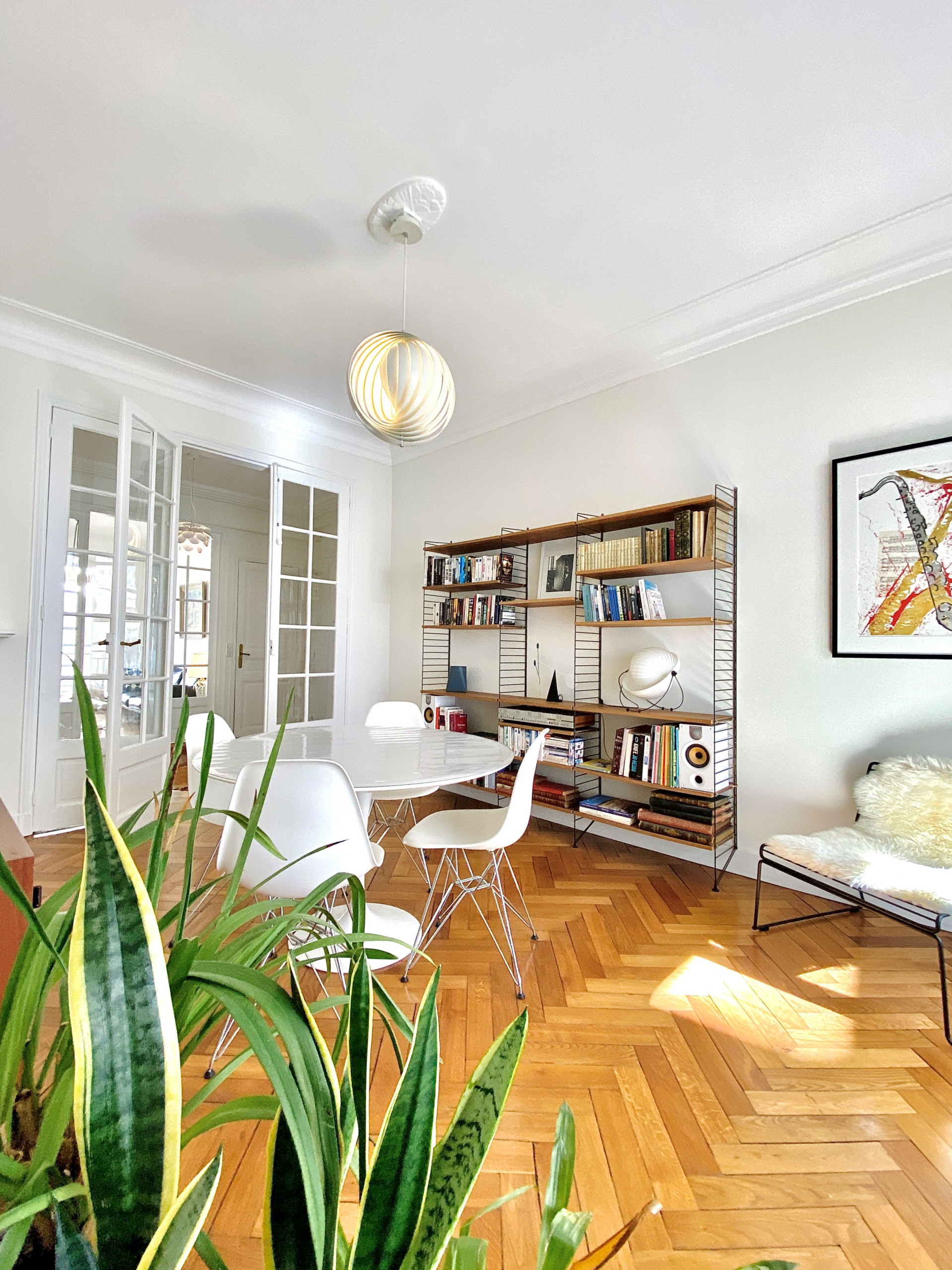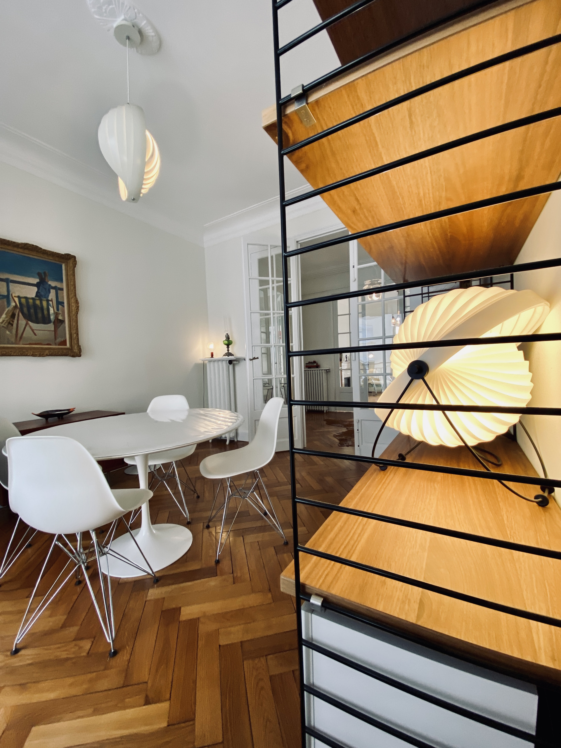A spacious living room and dining area with a balcony, furnished with designer furniture for an elegant atmosphere.