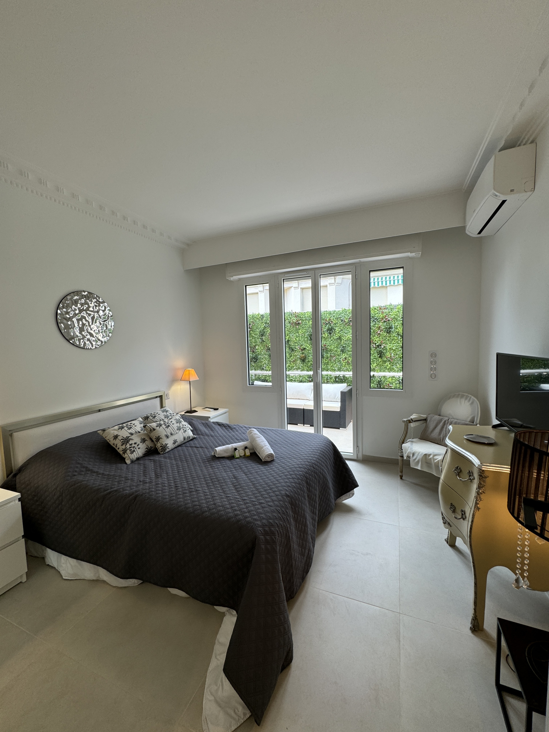 2 rooms of approximately 50m², terrace, on the 6th floor with lift at the Gray d'Albion residence . Bedroom with double bed 160x200, en-suite bathroom with washbasin, bath, toilet, hairdryer. Living room with sofa bed, TV, WIFI . Open kitchen with fridge, combined microwave, electric plate 2 hobs, kettle, toaster, Nespresso coffee machine. Guest toilet. Air conditioning by the building . Beautiful terrace with outdoor furniture. High-end building: security 7/7 - 24/24 Collective hot water, individual electric heating . Payable parking in the basement. 5mn walk from the Palais des Festivals, train station and airport shuttle. Shops, supermarkets and restaurants nearby. 30km from Nice Côte d'Azur airport, 12km from Mandelieu Golf Course1 review