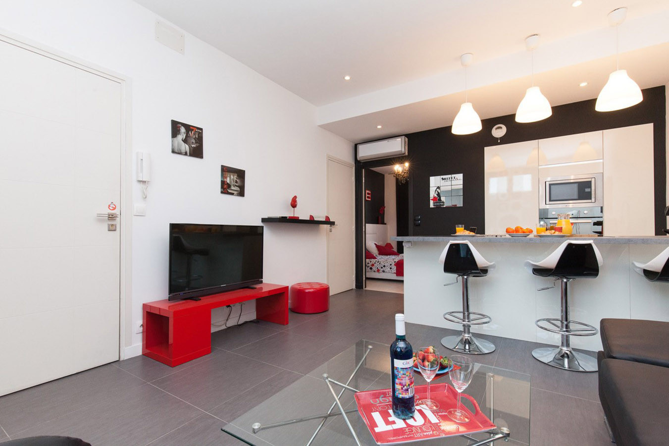 The living room offers a sofa bed, a television, a fully equipped open-plan kitchen: 2 hobs electric plate, refrigerator, freezer, microwave oven, traditional oven, as well as crockery, cutlery, kitchen utensils, a Nespresso coffee maker and a kettle.