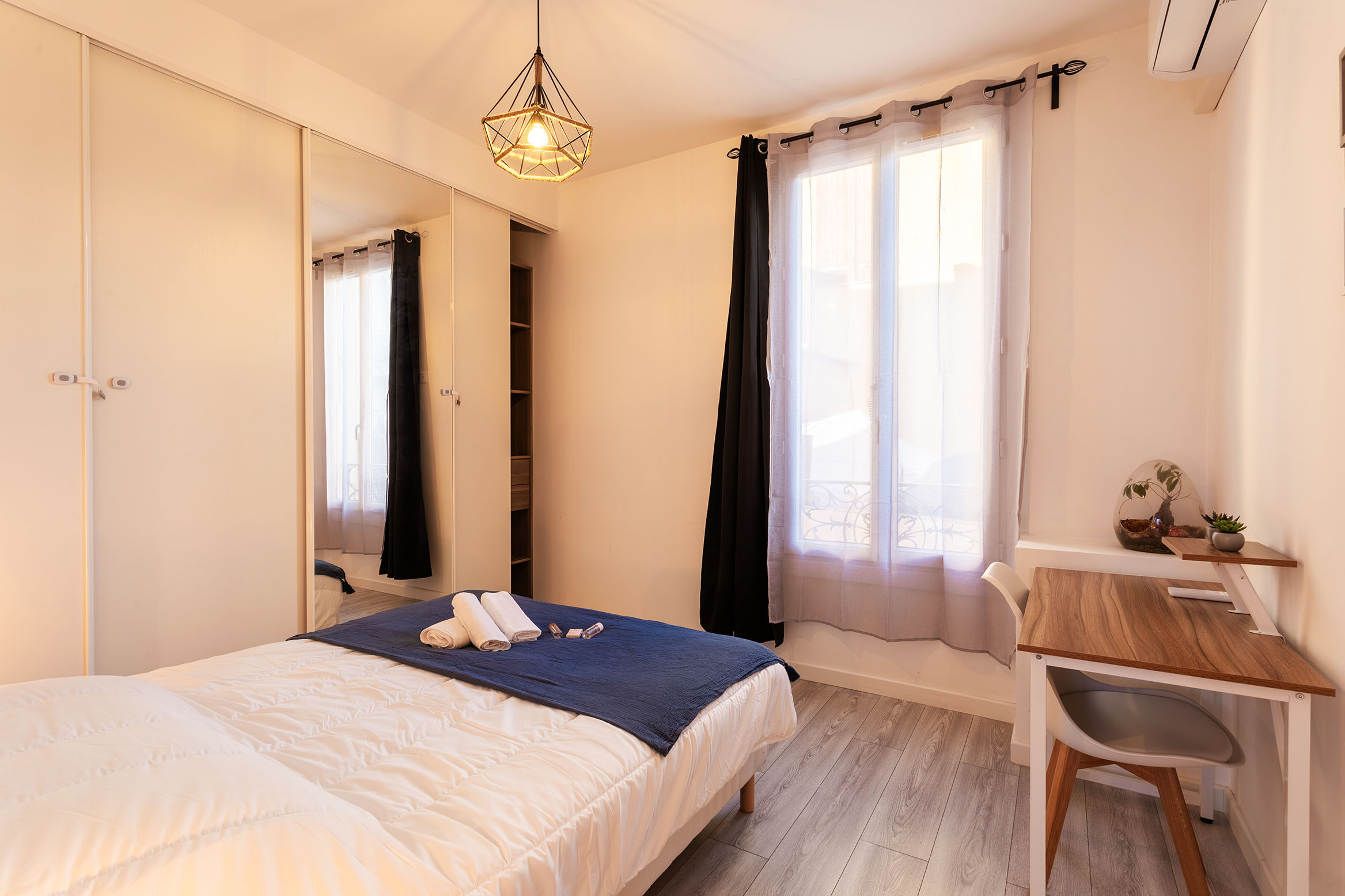 - Two comfortable bedrooms, each with a double bed and small desk