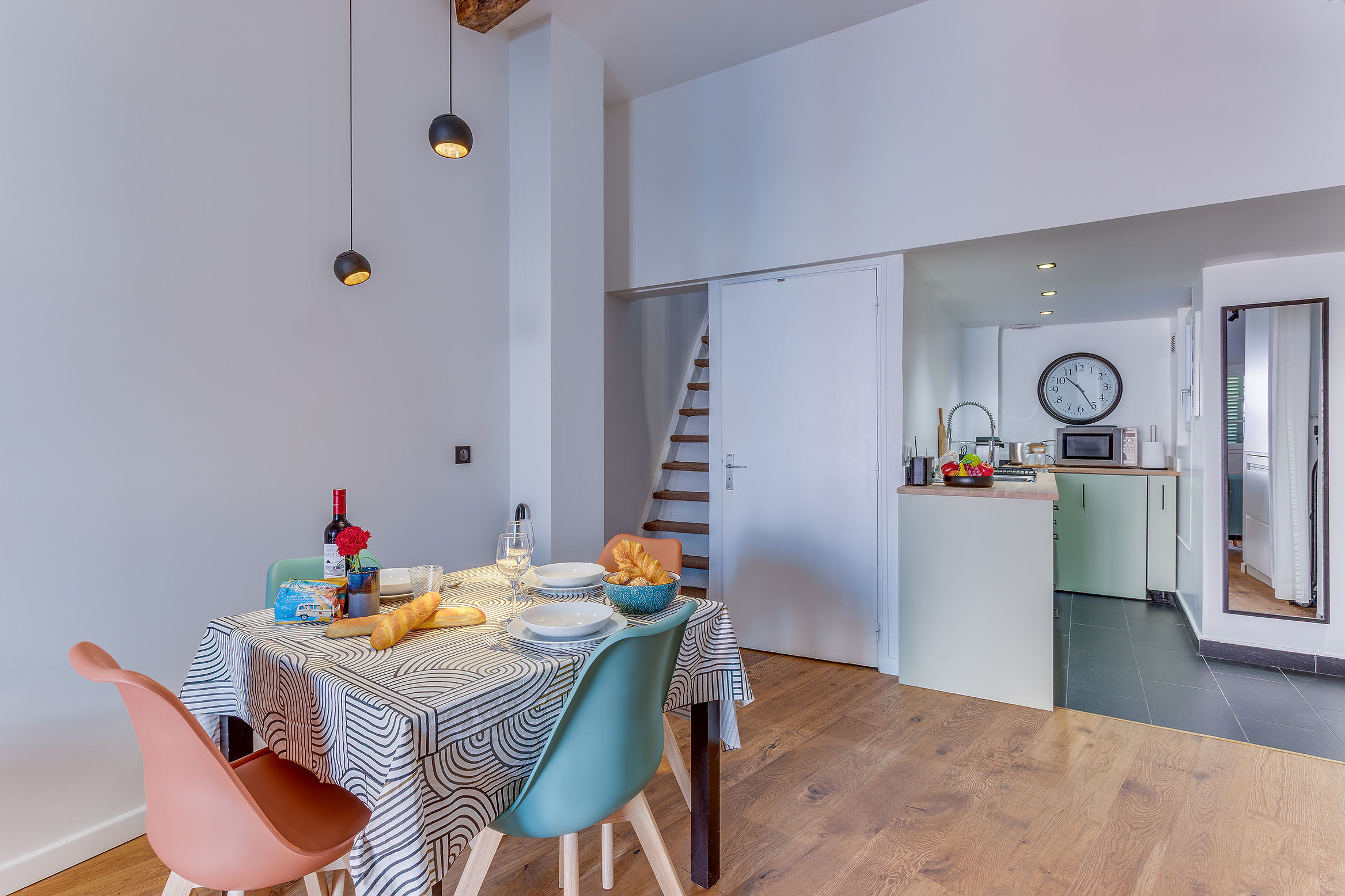 Located on the 2nd and top floor of a typical building without a lift, it blends period charm with modern comfort.