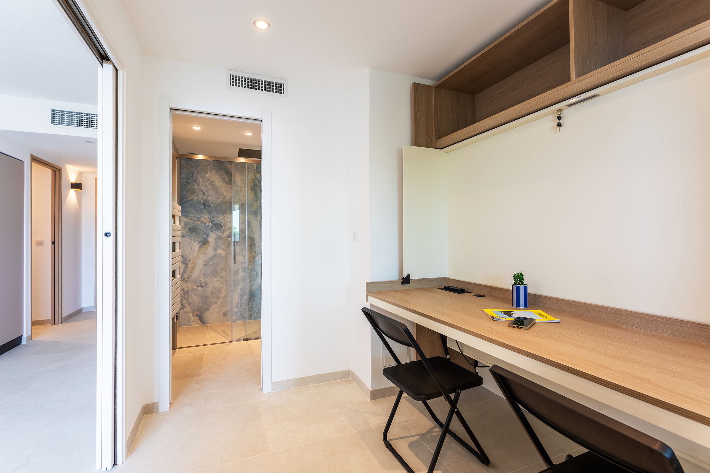 It consists of a fully equipped independent kitchen, a living room with a sofa bed for 1 person - a dining area with a sublime sea view, a bedroom with 1 Queen Size bed, a bathroom with a shower, another bedroom / office with a retractable double bed, a bathroom with a shower and a separate toilet.
