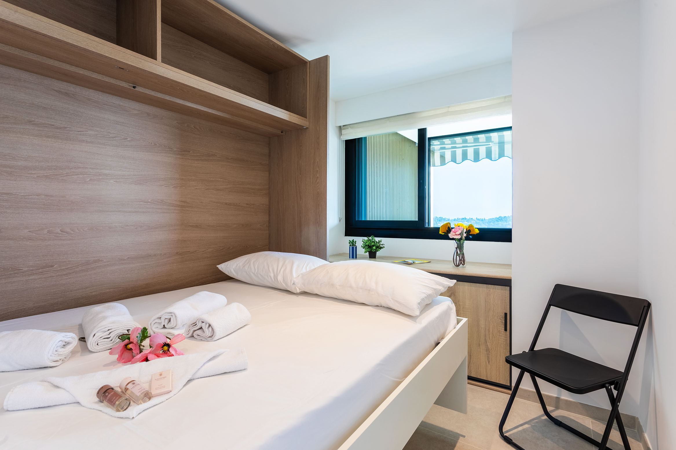 It consists of a fully equipped independent kitchen, a living - dining room opening onto a furnished terrace with a dining area and sea view, a bedroom with 1 Queen Size bed and another bedroom with a sofa bed and a single bed, a bathroom with a shower and 2 toilets.