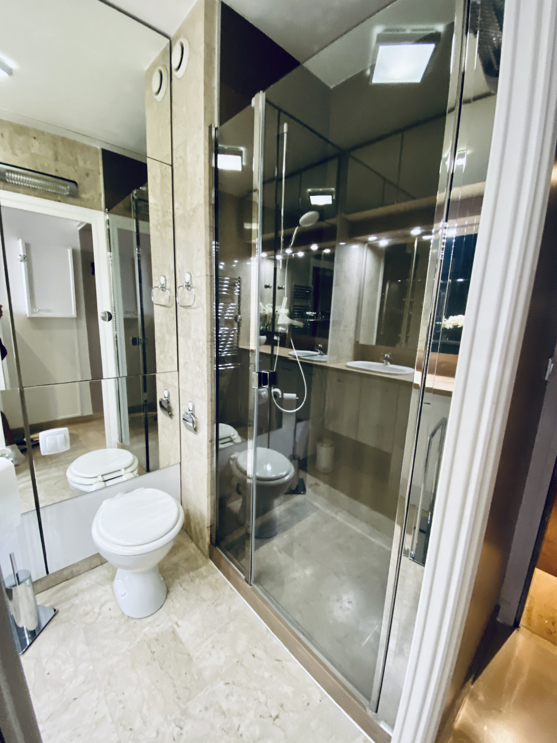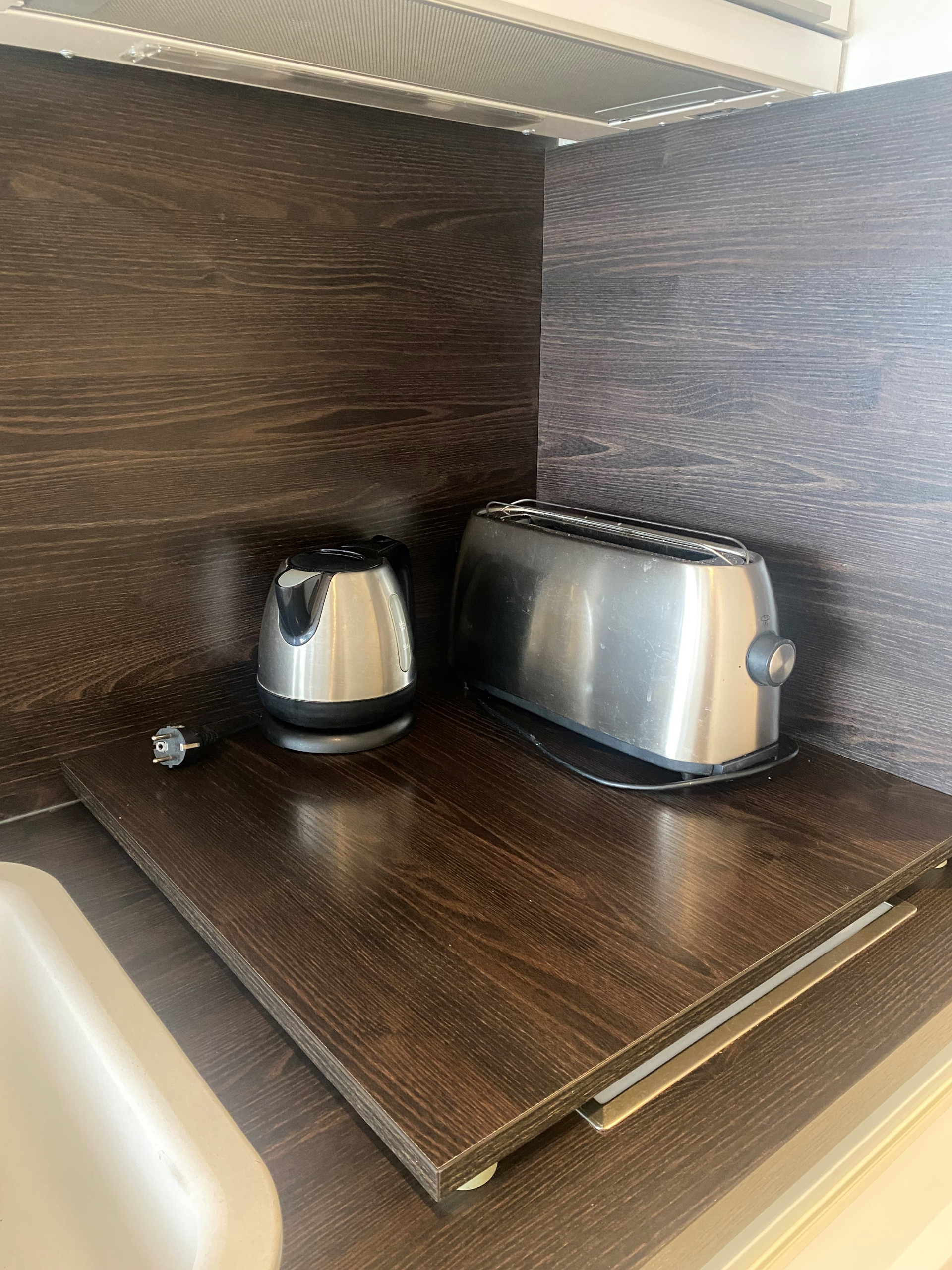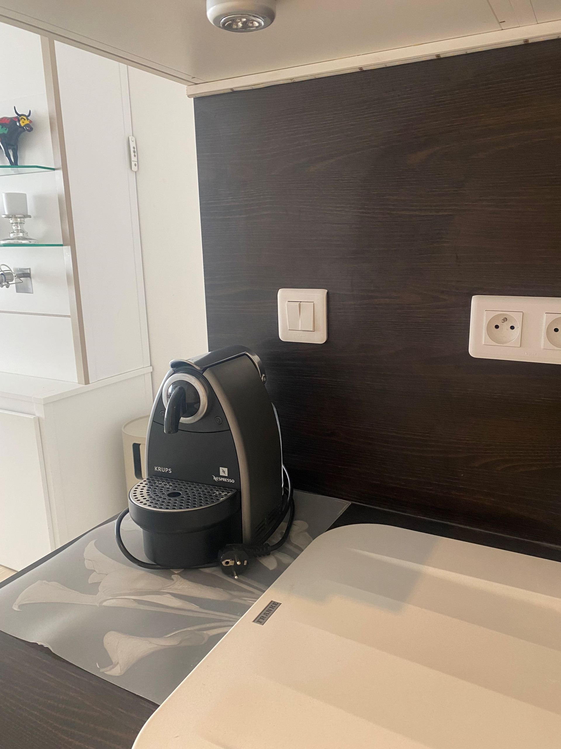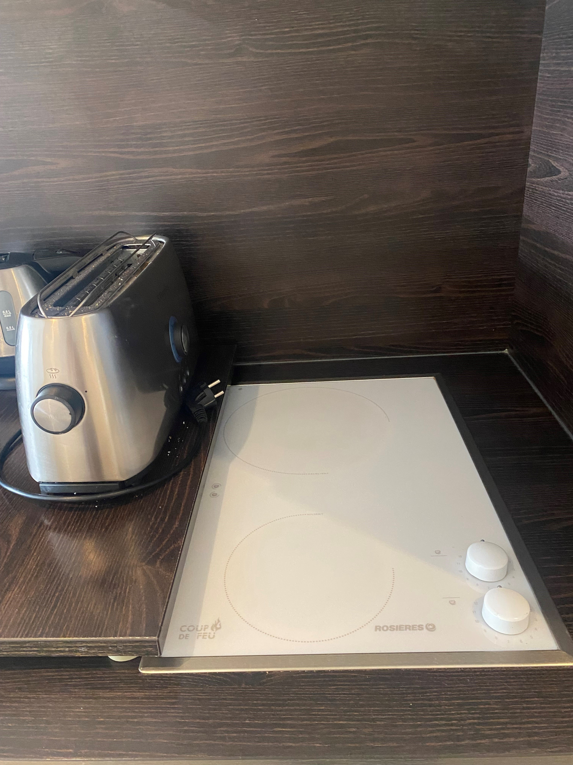 The living area is equipped with an electric fold-down bed for two people, allowing optimisation of the available space. You will also find a television, a kitchen area excellently fitted with a refrigerator, a 2-burner hob, a Nespresso coffee machine, a microwave, a kettle, a toaster, crockery and cutlery, as well as storage, offering a complete solution for your stay.