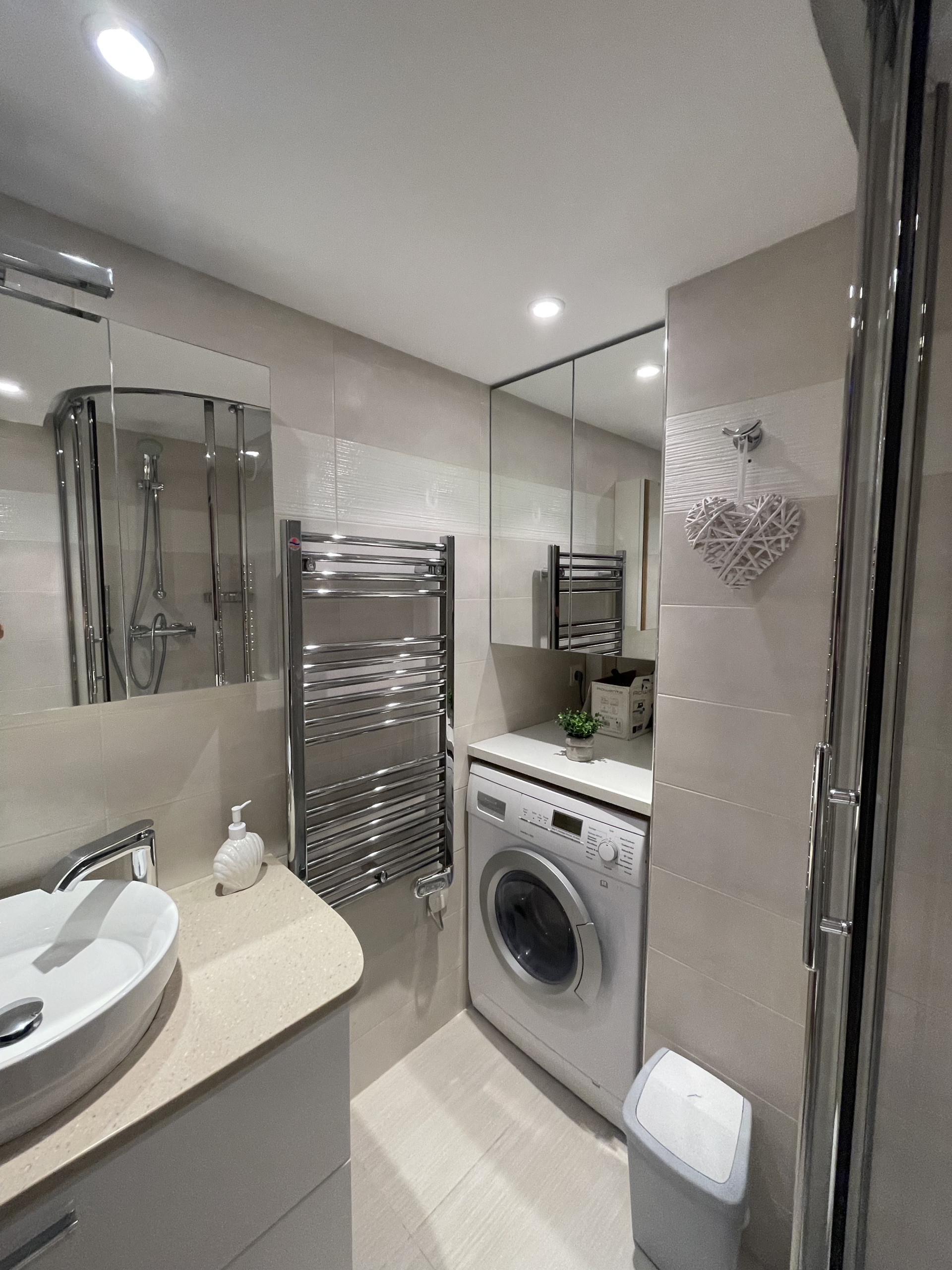 The shower room is provided with a toilet, a hairdryer and a washing machine.