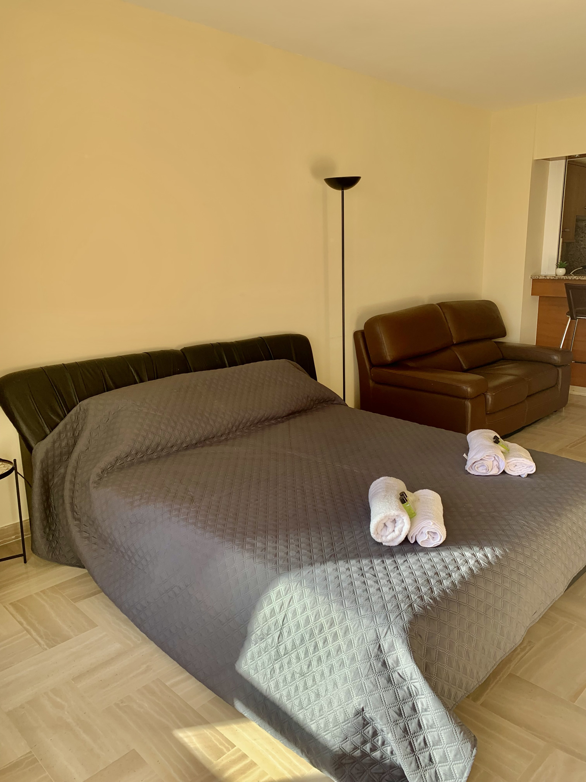 Inside, our 30m2 studio provides an elegant and well-appointed space. The living area features a comfortable double bed for two guests and an additional sofa bed, accommodating up to four people. Entertain yourself with the TV and stay connected with our high-speed WiFi.
