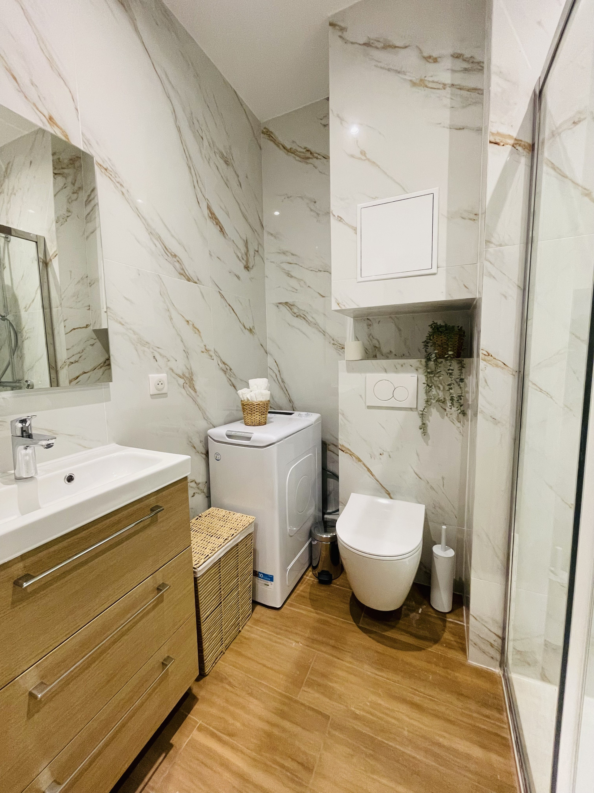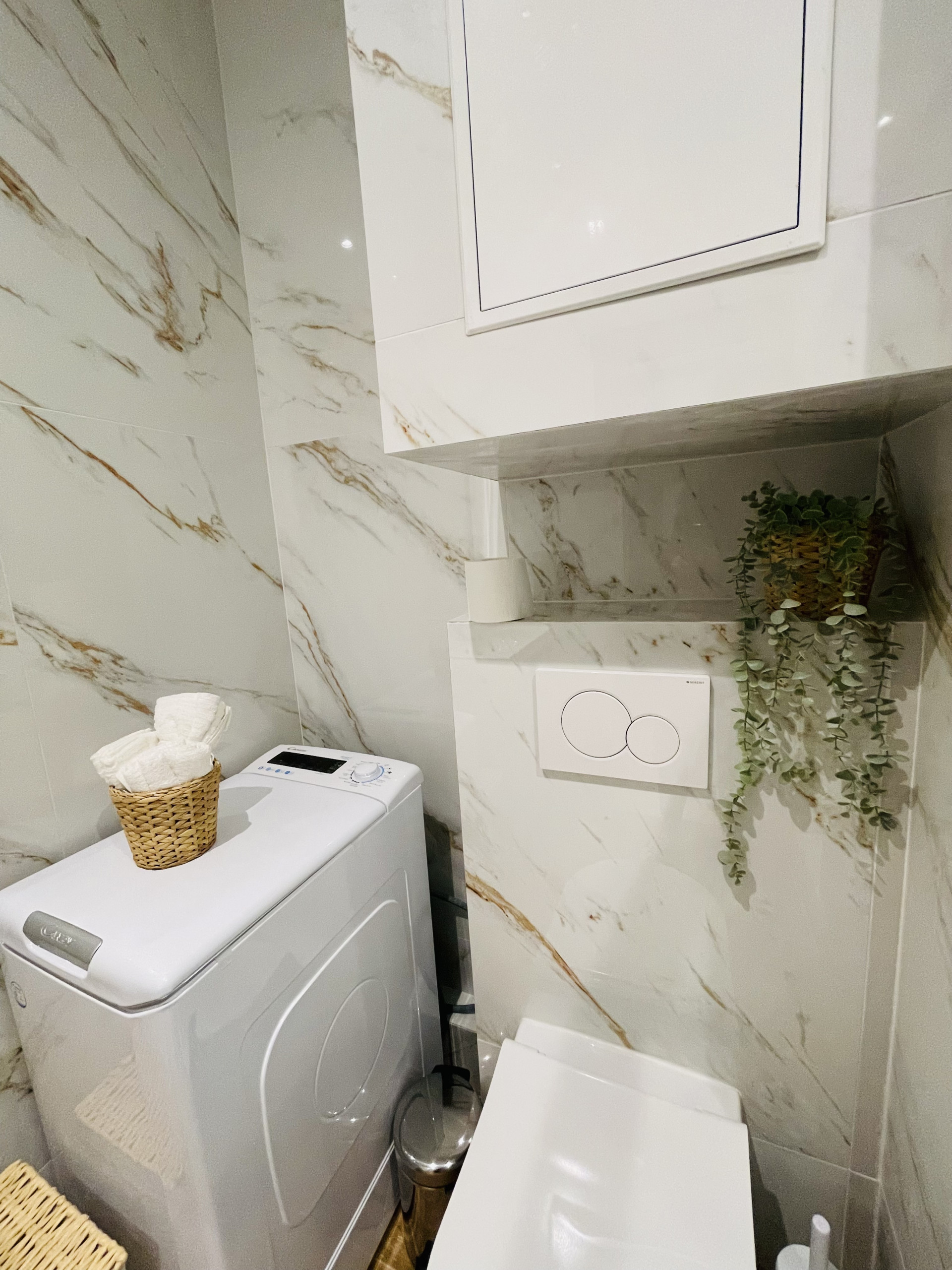 The shower room is provided with a toilet, a hairdryer and a washing machine.
