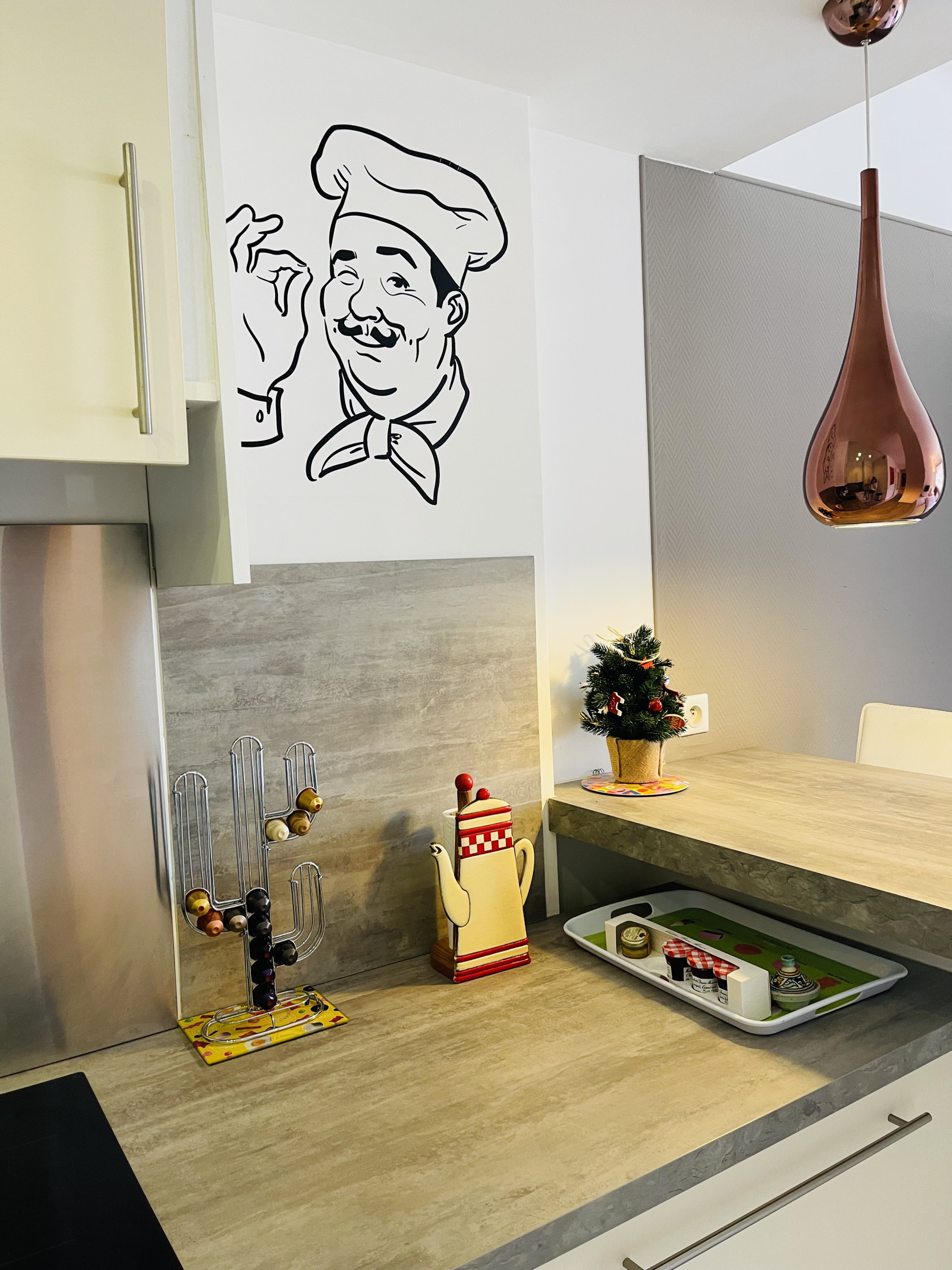 - The kitchen includes refrigerator, oven, microwave, dishwasher, filter coffee maker, Nespresso coffee maker, toaster, kettle, citrus press, as well as all the utensils necessary to prepare your meals. It is integrated discreetly with a standing table thus promoting optimal use of space.