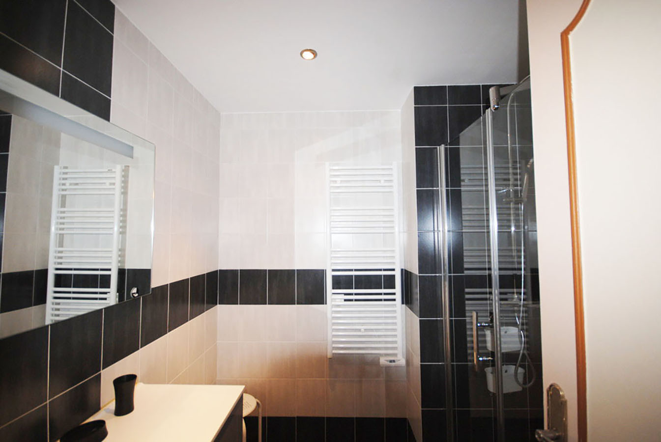 Upon entering, a welcoming entrance hall with a built-in closet invites you to discover this elegantly furnished studio. The tastefully decorated main room features a exceptionally comfortable sofa bed for two, facing a television with access to French channels and reliable wifi for staying connected.