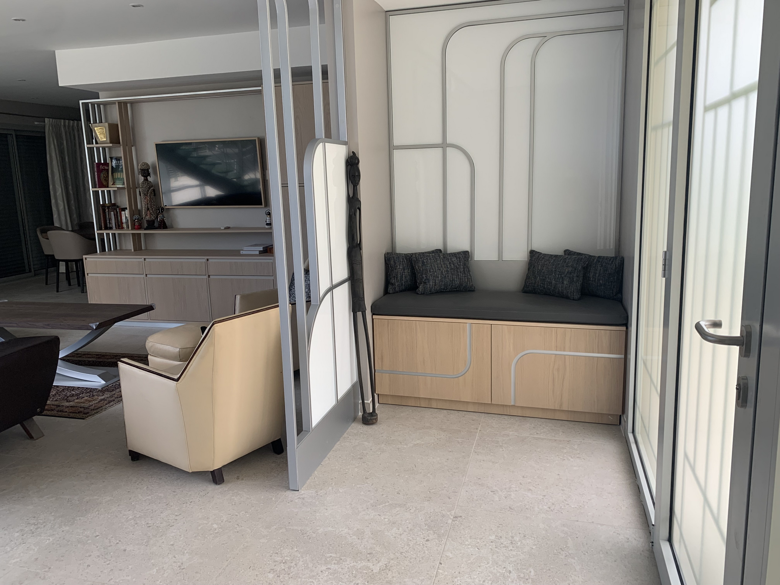 This brand new construction showcases Art Deco design with quality materials, top-of-the-range equipment, and refined decor, creating a serene atmosphere amidst the pine and palm trees.
