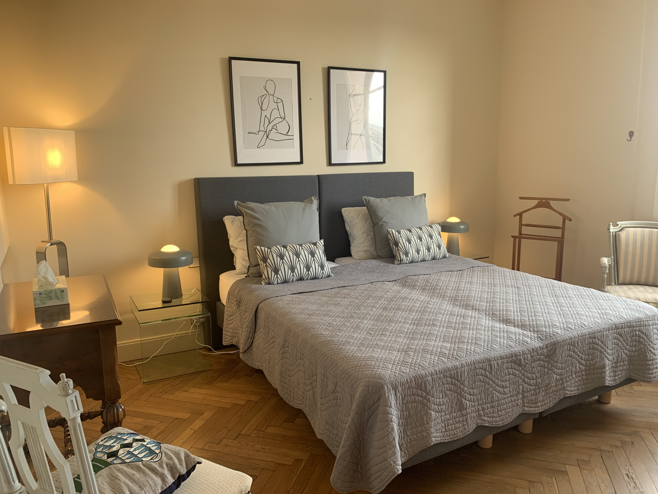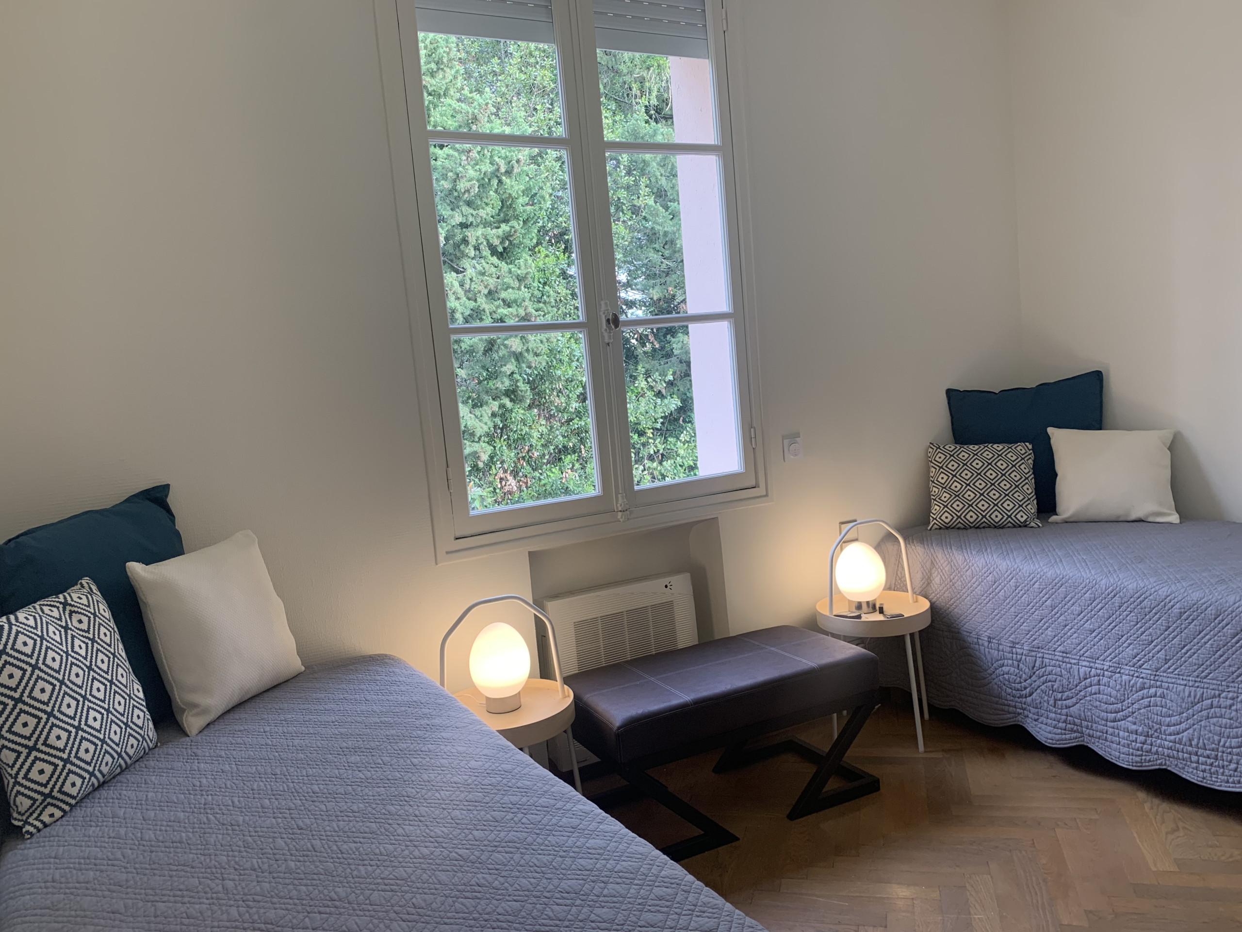 On first floor (also accessible with lift) 2 bedrooms with twin beds (2x90 or 1x180) and their en-suite bathrooms with wc, 1 bedroom with double bed (160 ) and a room with 2 single beds (2x90) this last room is on the way to one of the previous. To complete this level 1 bathroom and wc. Two bedrooms have théorie private terrace.