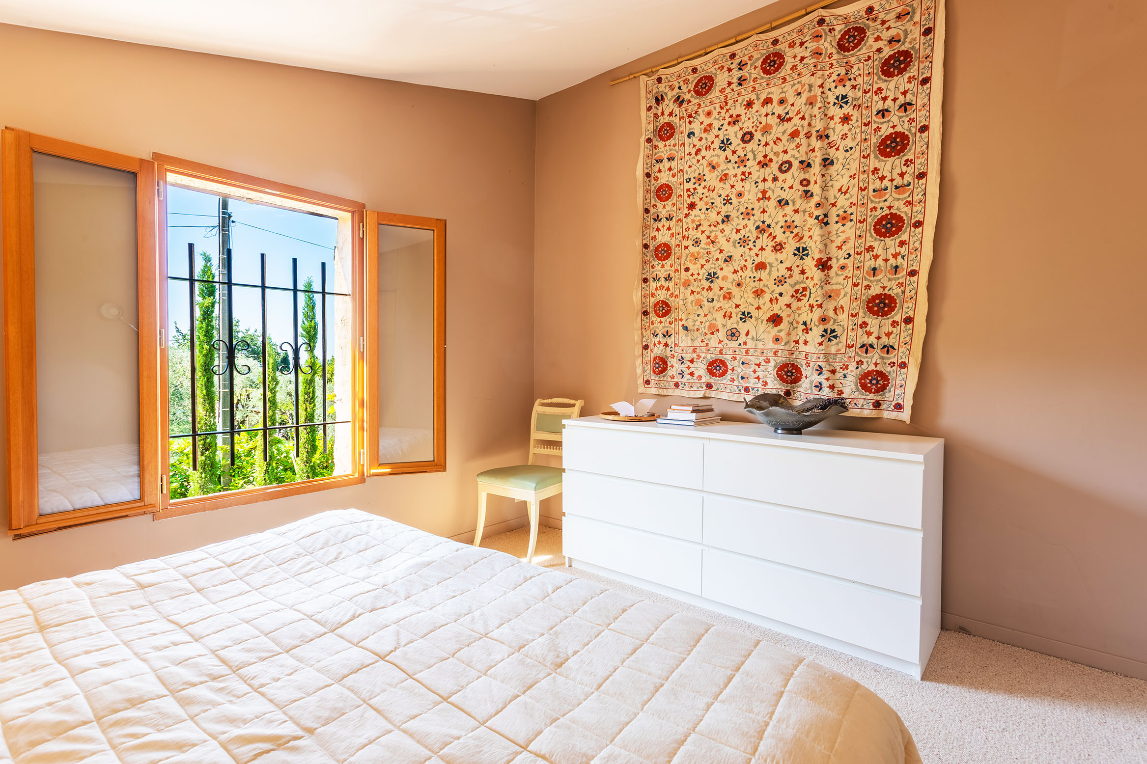 This charming seasonal rental villa enjoys breathtaking panoramic views of the surrounding greenery and hills.
