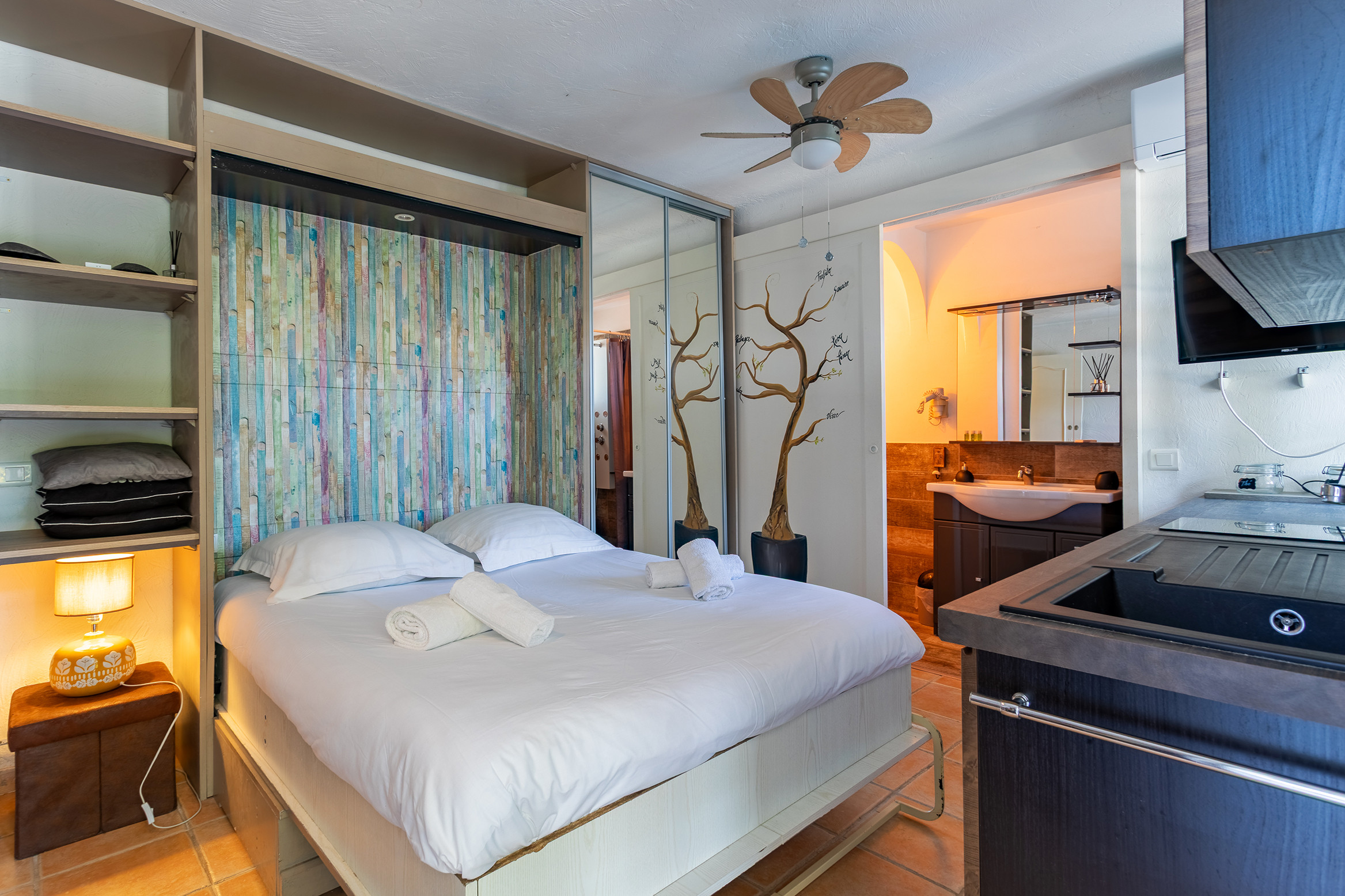 On the garden level, 5 apartments equipped either in studio or in 2 rooms each sleeping 2 people and a bathroom with wc in each, a large terrace along the property.