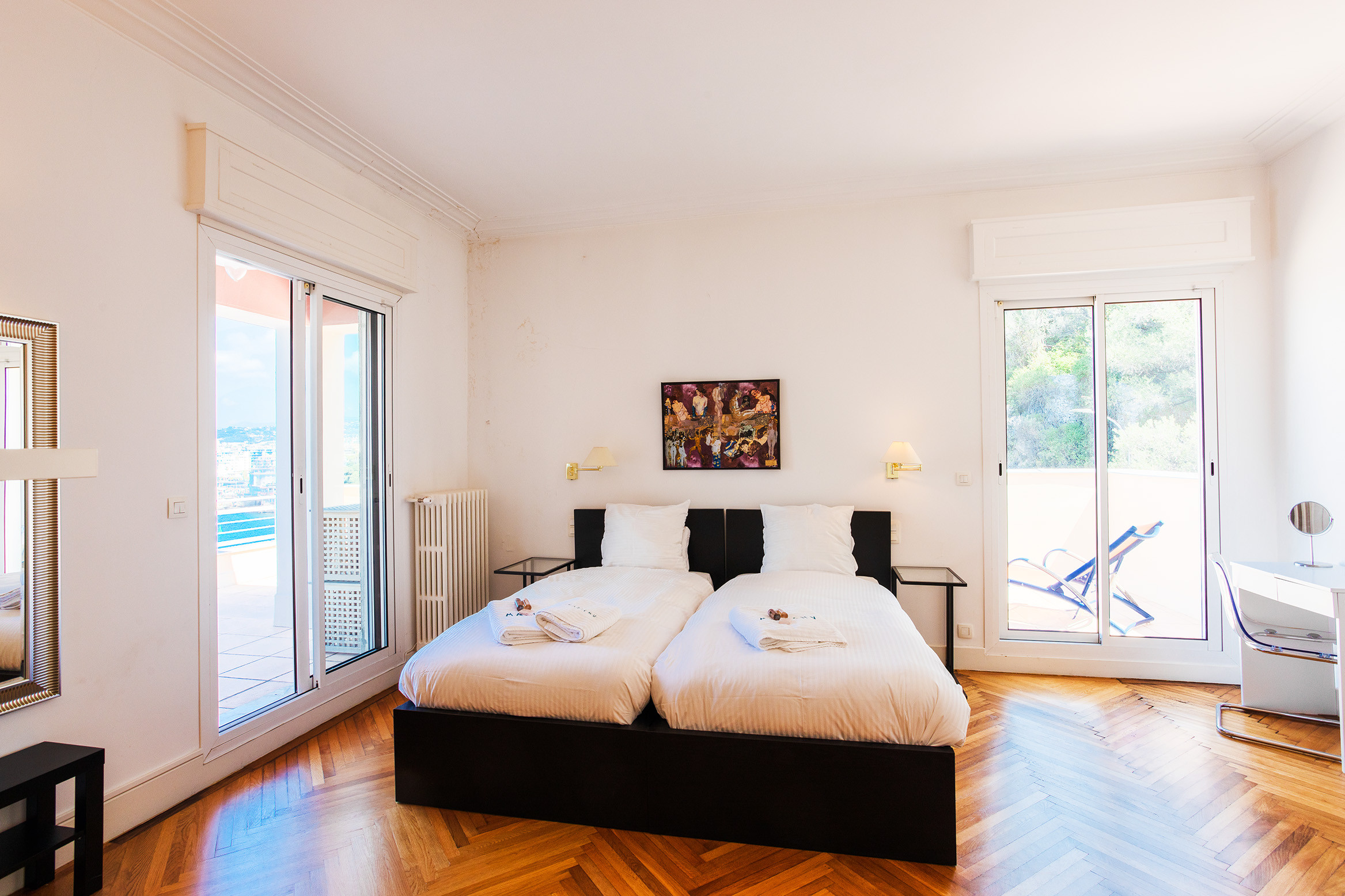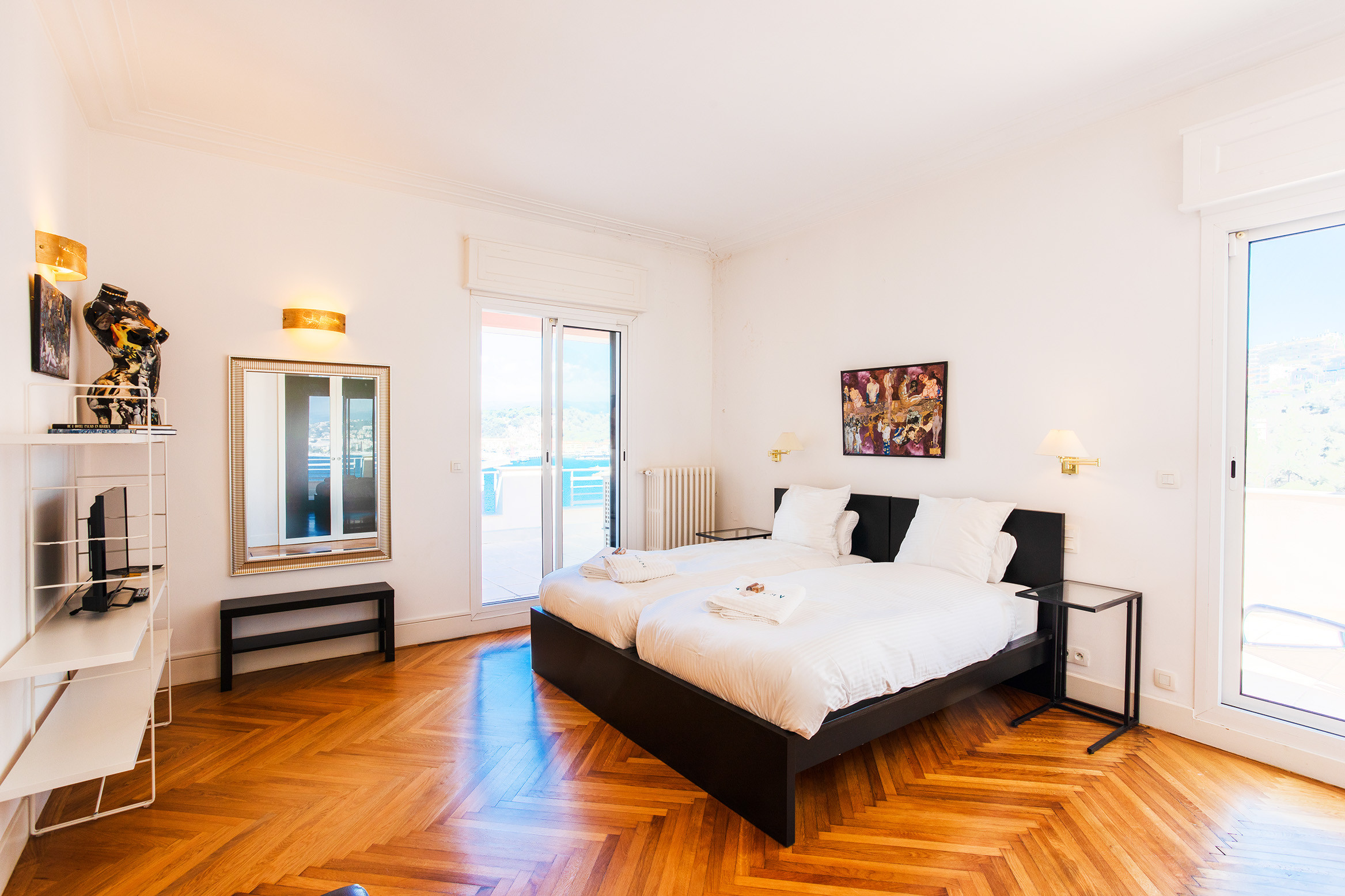 - Three bedrooms: the first with a Queen size bed, its hydrotherapy shower room and toilet, the second with a King size bed and its terrace, and the last with 2 single beds brought together to form one large bed and its corner terrace,