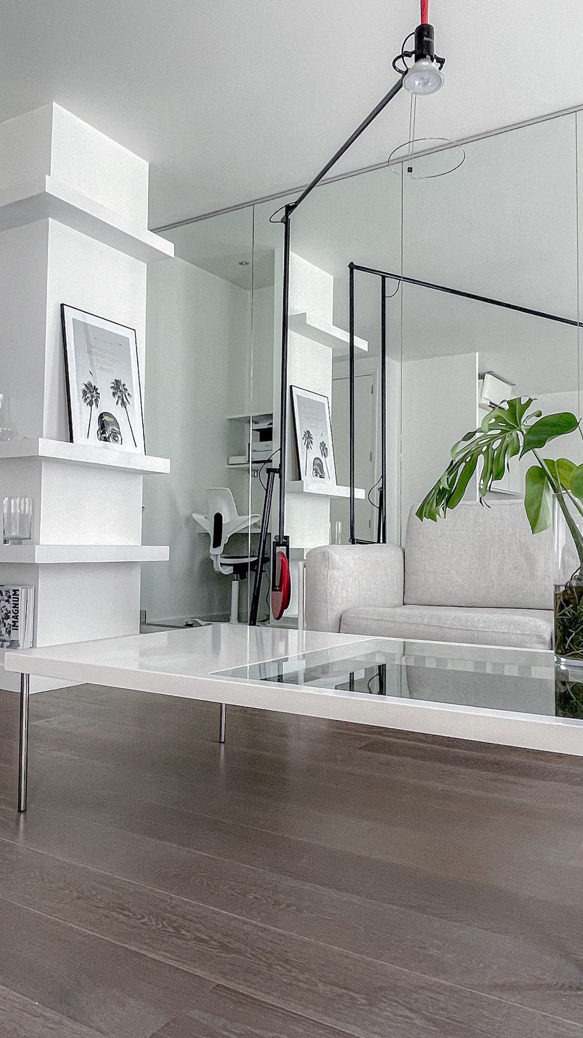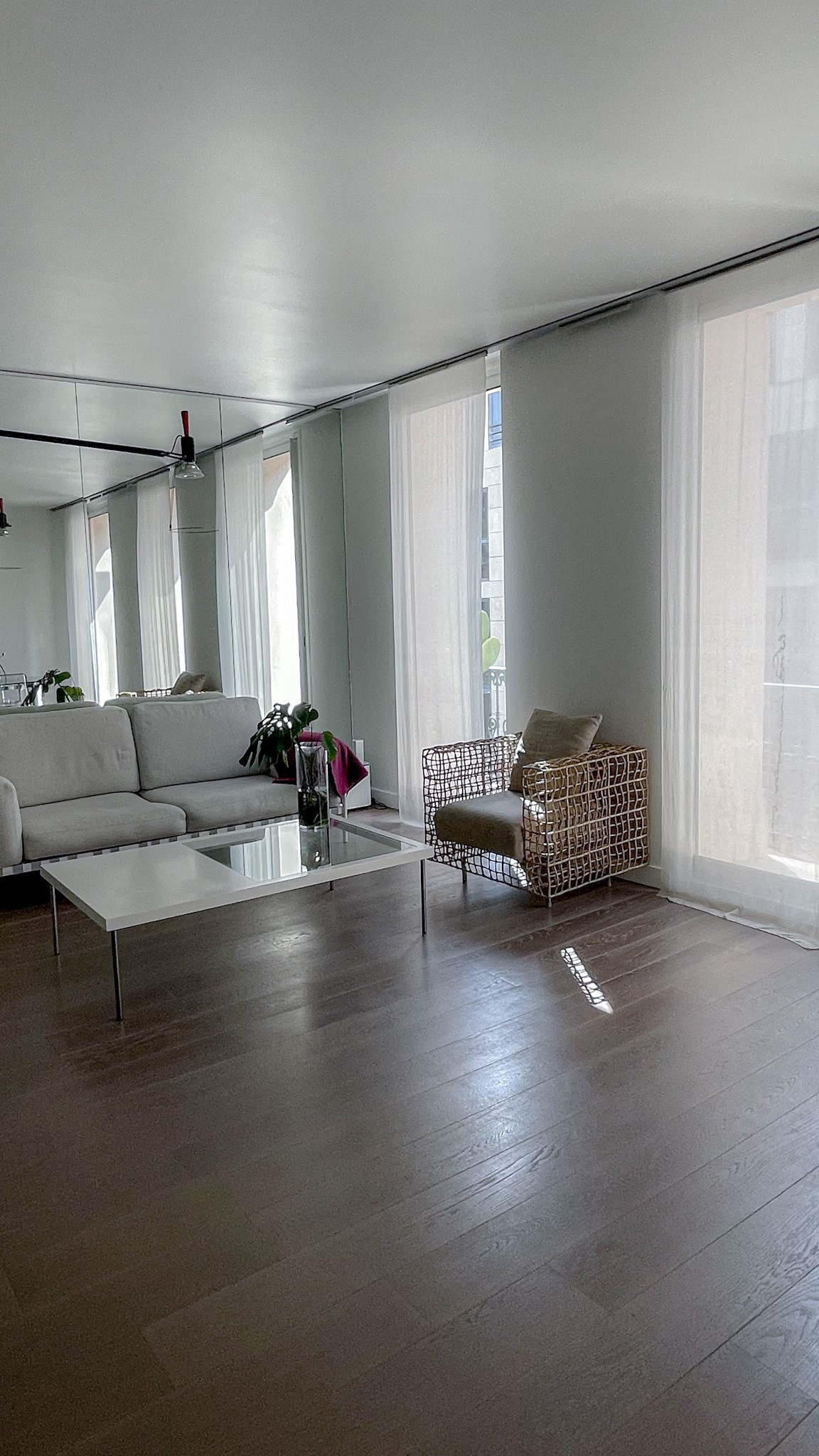 Grand salon lumineux, petit coin bureau, balcon, TV