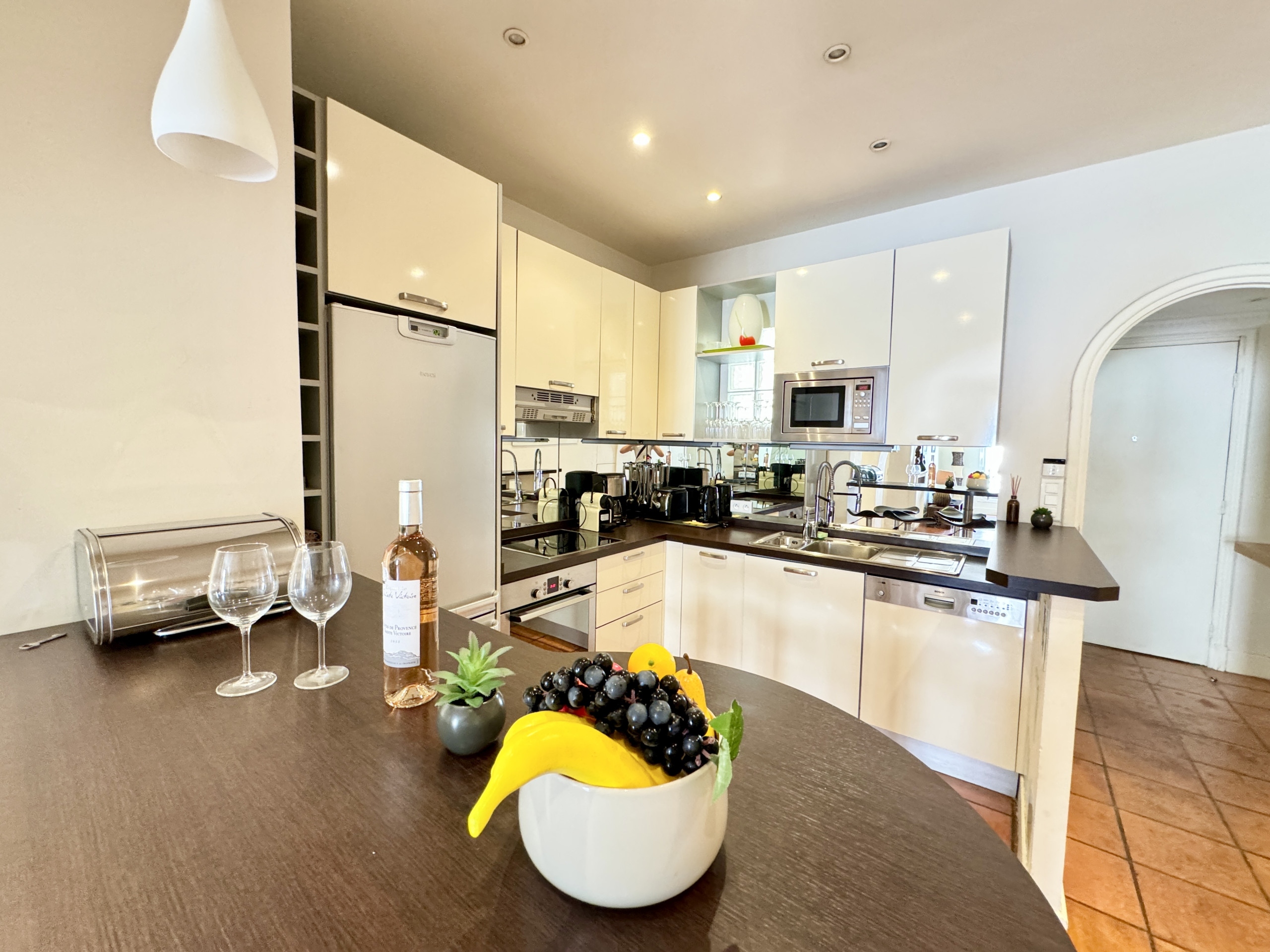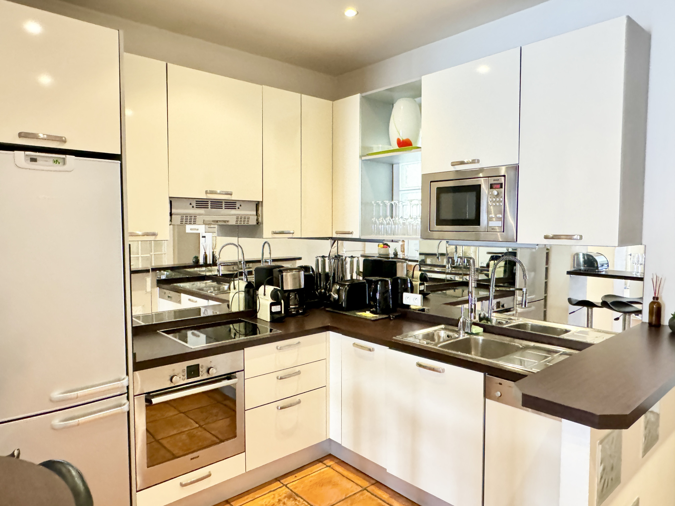 L'espace cuisine avec une partie mange debout : lave vaisselle, plaque vitro, four, micro onde, réfrigérateur, congélateur, Cafetière Nespresso, bouilloire, grille pain, une grande table dépliable pour 8 personnes,