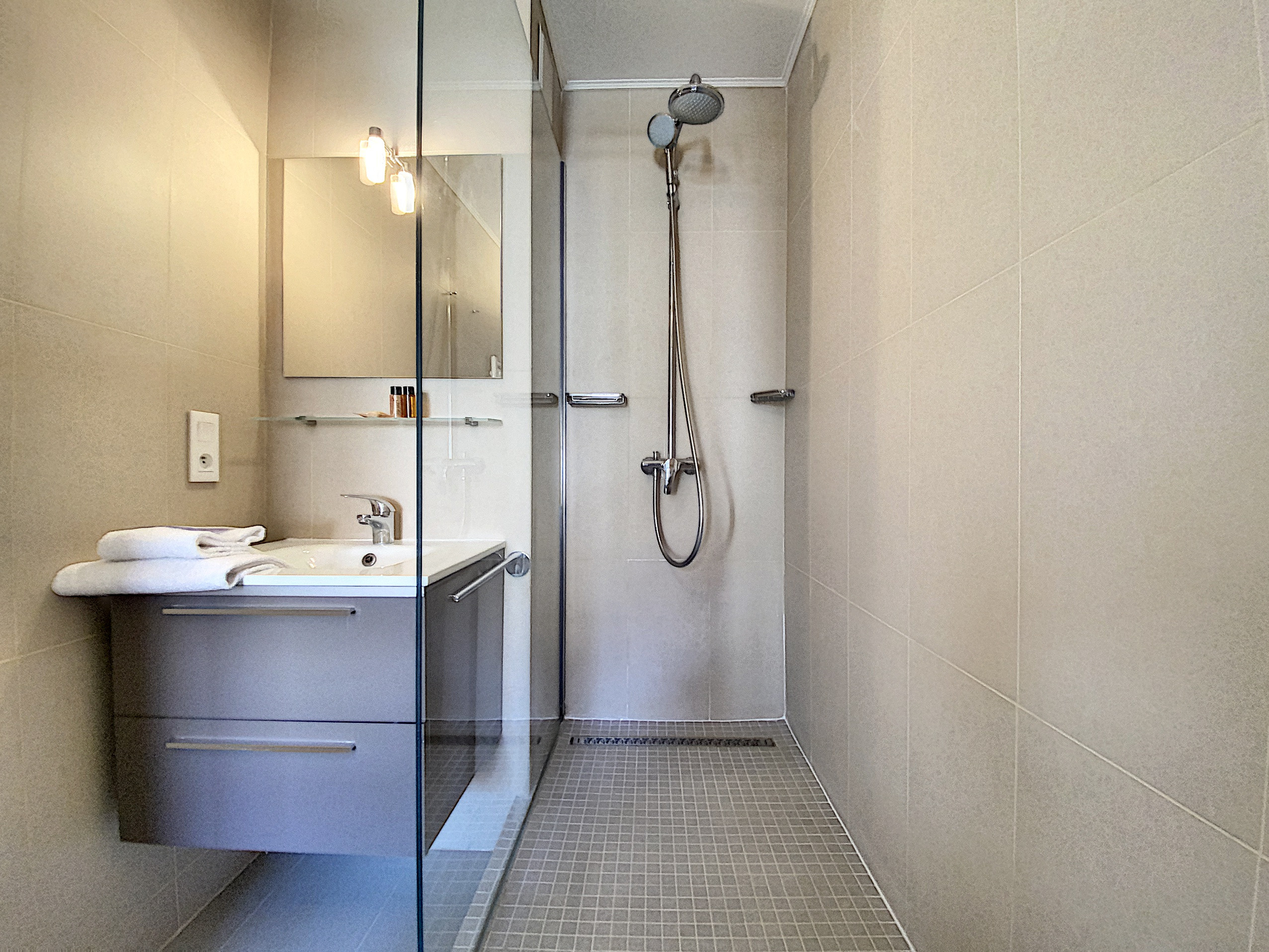La salle de bains est équipée d'une douche, et d'un sèche-cheveux, et les toilettes sont séparées pour plus de commodité. L'appartement bénéficie de la climatisation fournie par l'immeuble, assurant un confort optimal. Une terrasse avec mobilier d'extérieur offre un espace extérieur agréable pour profiter du climat méditerranéen. Un fer et table à repasser sont à disposition.