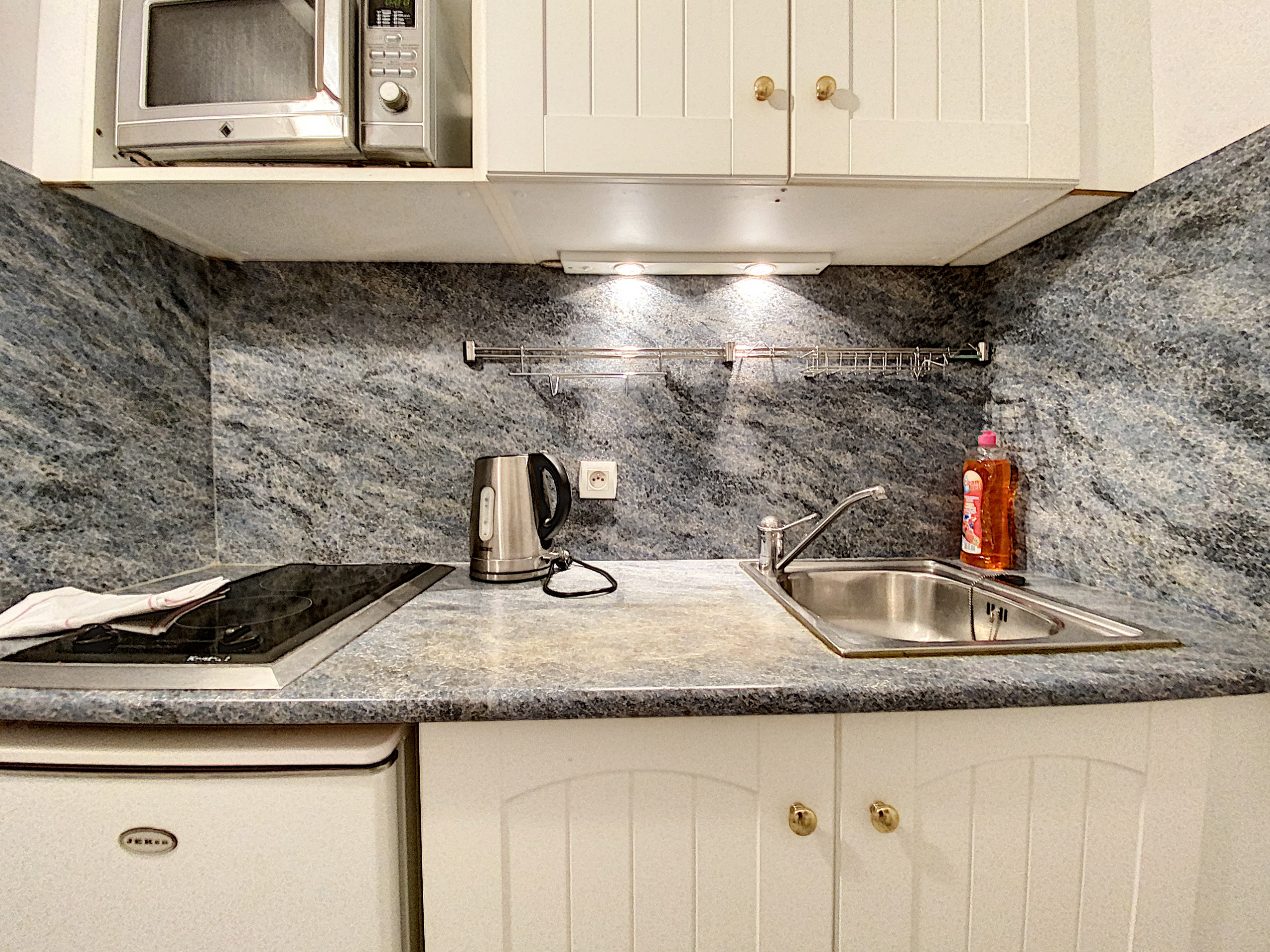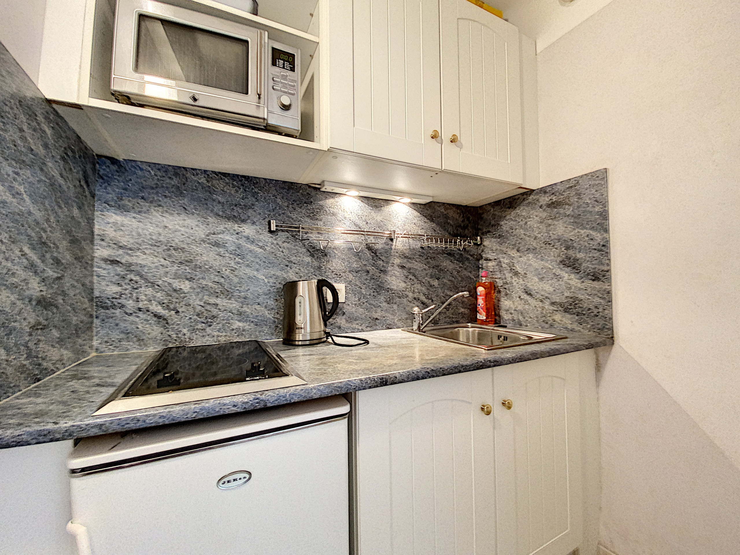 La cuisine, ouverte sur le séjour est très bien équipée : un réfrigérateur, un micro-ondes combiné, une plaque électrique 2 feux, une bouilloire, une cafetière Nespresso et un grille-pain, offrant tout le nécessaire pour préparer vos repas.