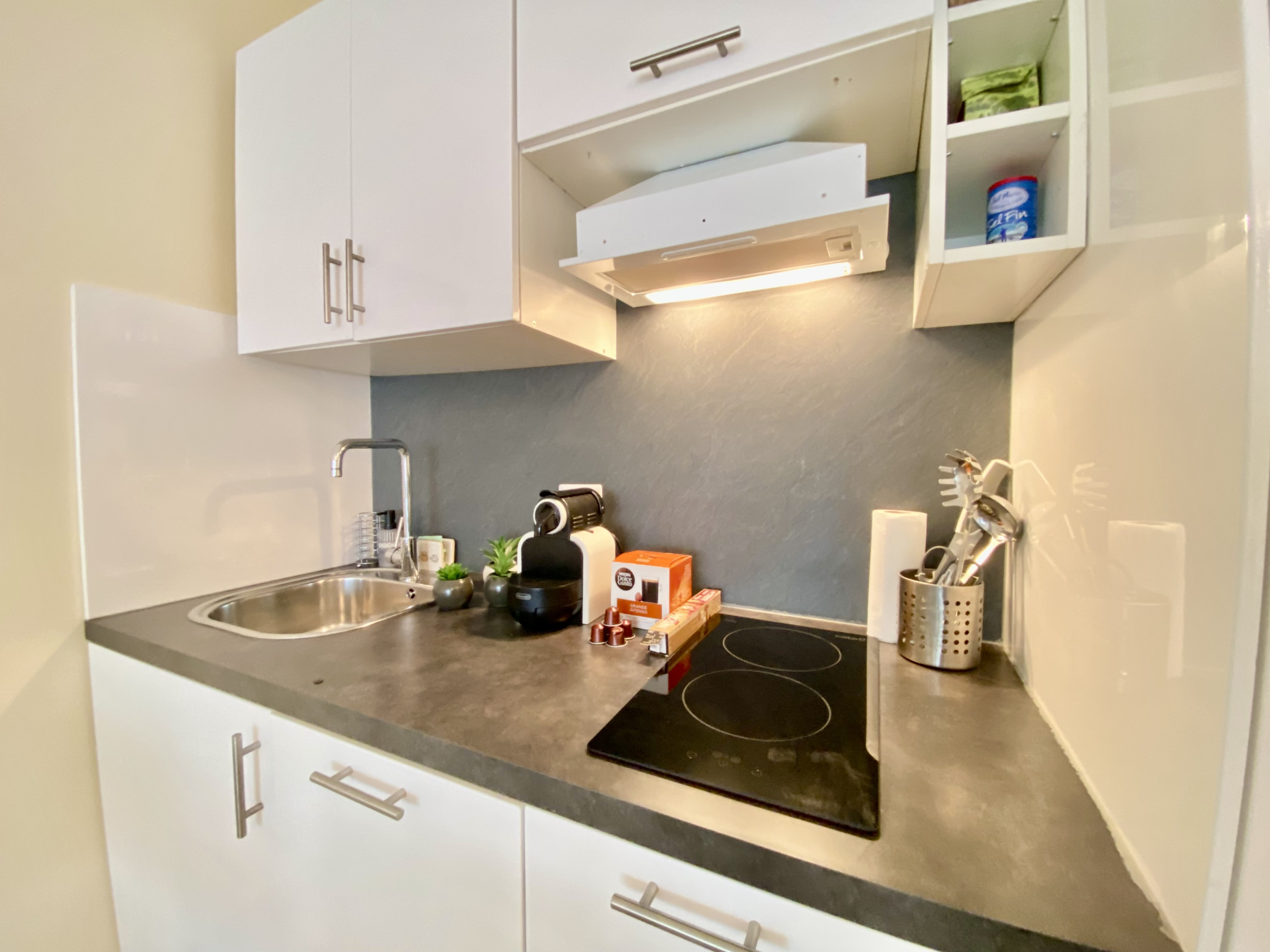 La cuisine américaine, entièrement équipée (réfrigérateur, lave-linge, lave-vaisselle, micro-ondes, cafetière, bouilloire, grille-pain, etc.), facilite la préparation des repas.