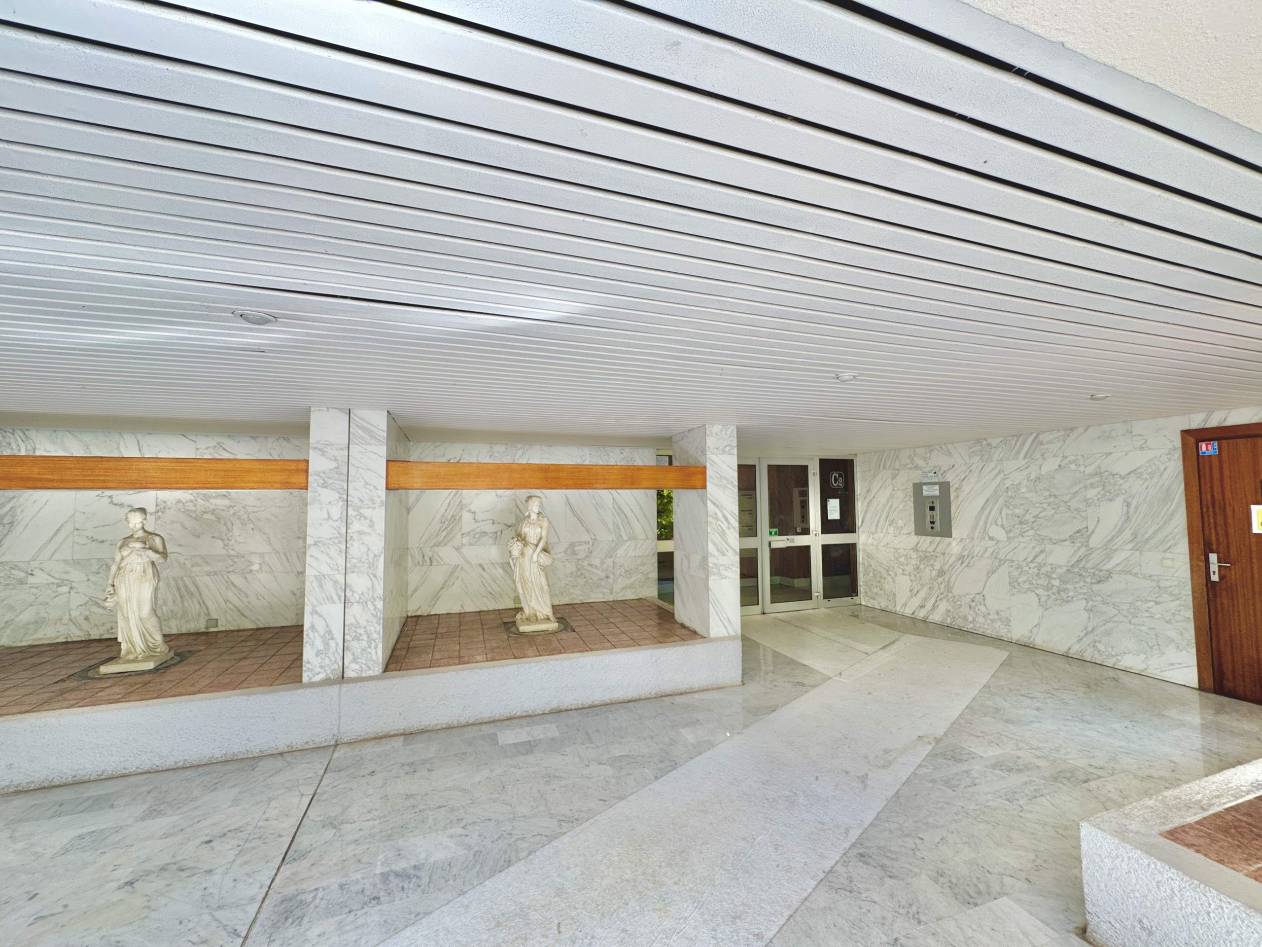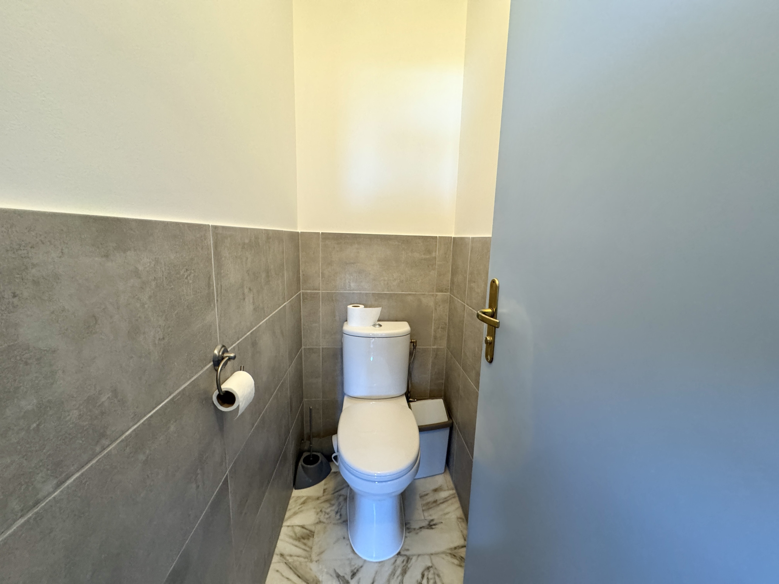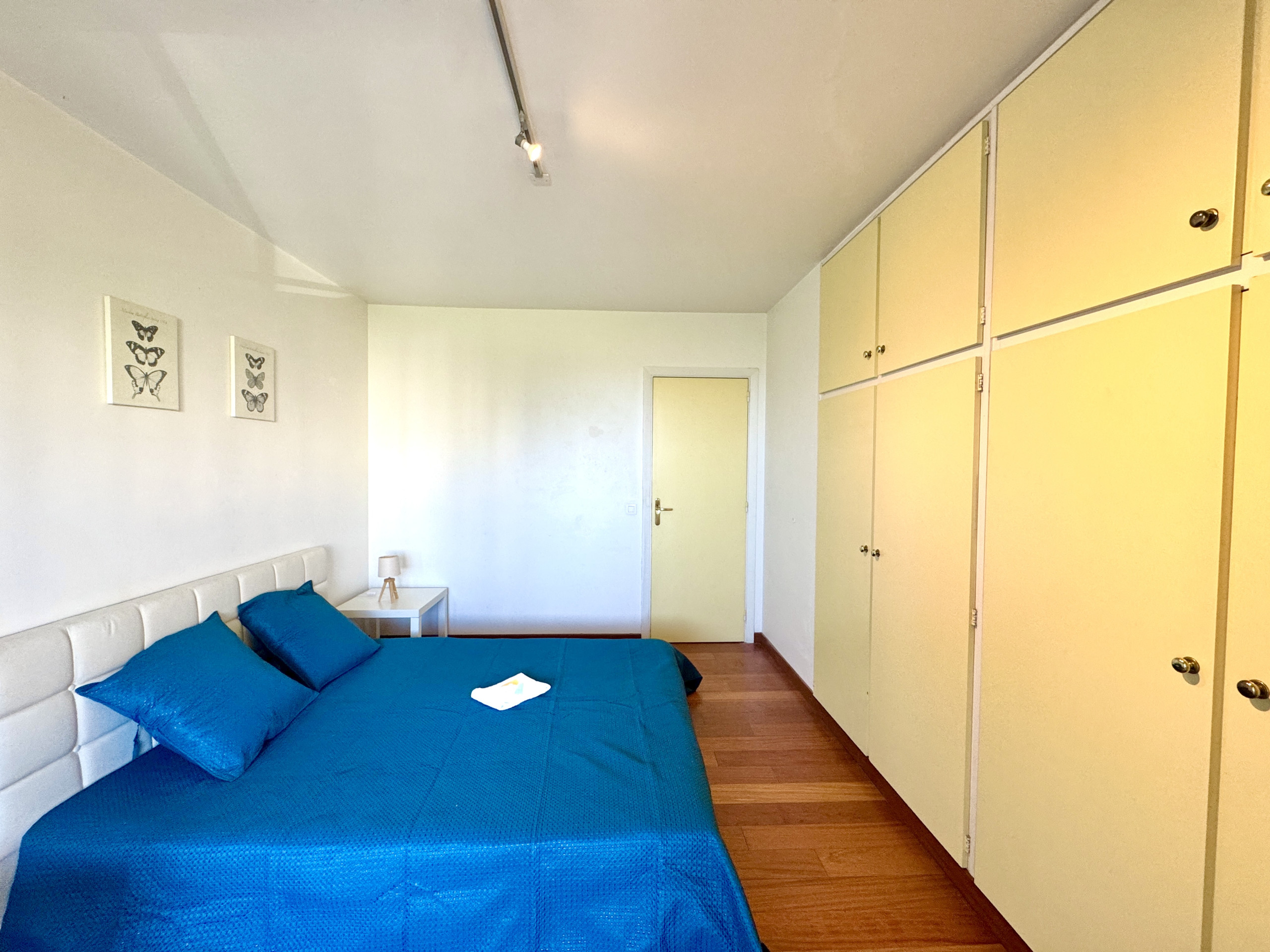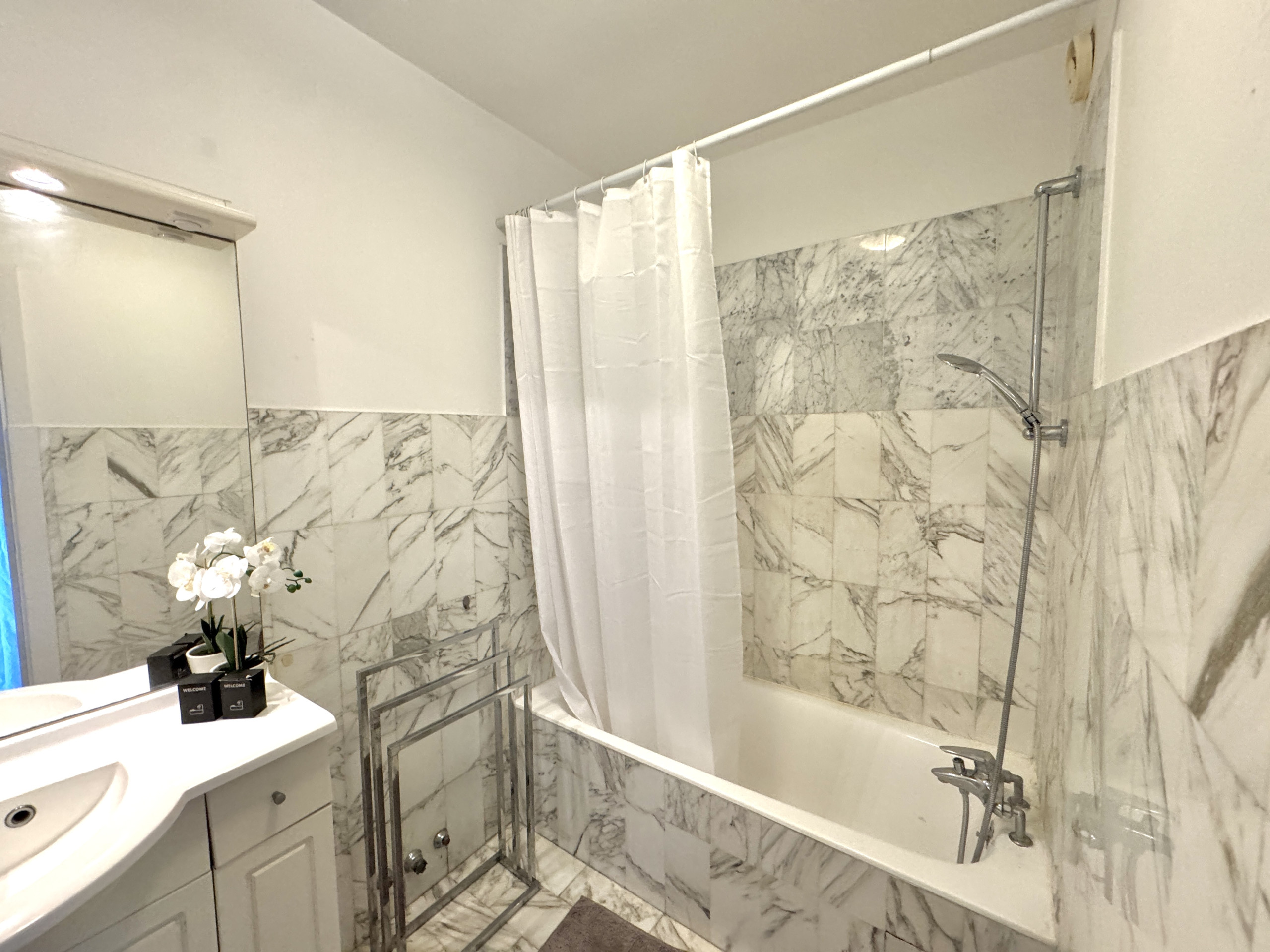 La chambre, dotée d'une grande armoire encastrée et d'un parquet chaleureux, garantit confort et tranquillité pour un repos de qualité. La salle de bain, entièrement revêtue de marbre blanc veiné, est équipée d'une baignoire avec douche — des prestations soignées pour un séjour tout confort.
