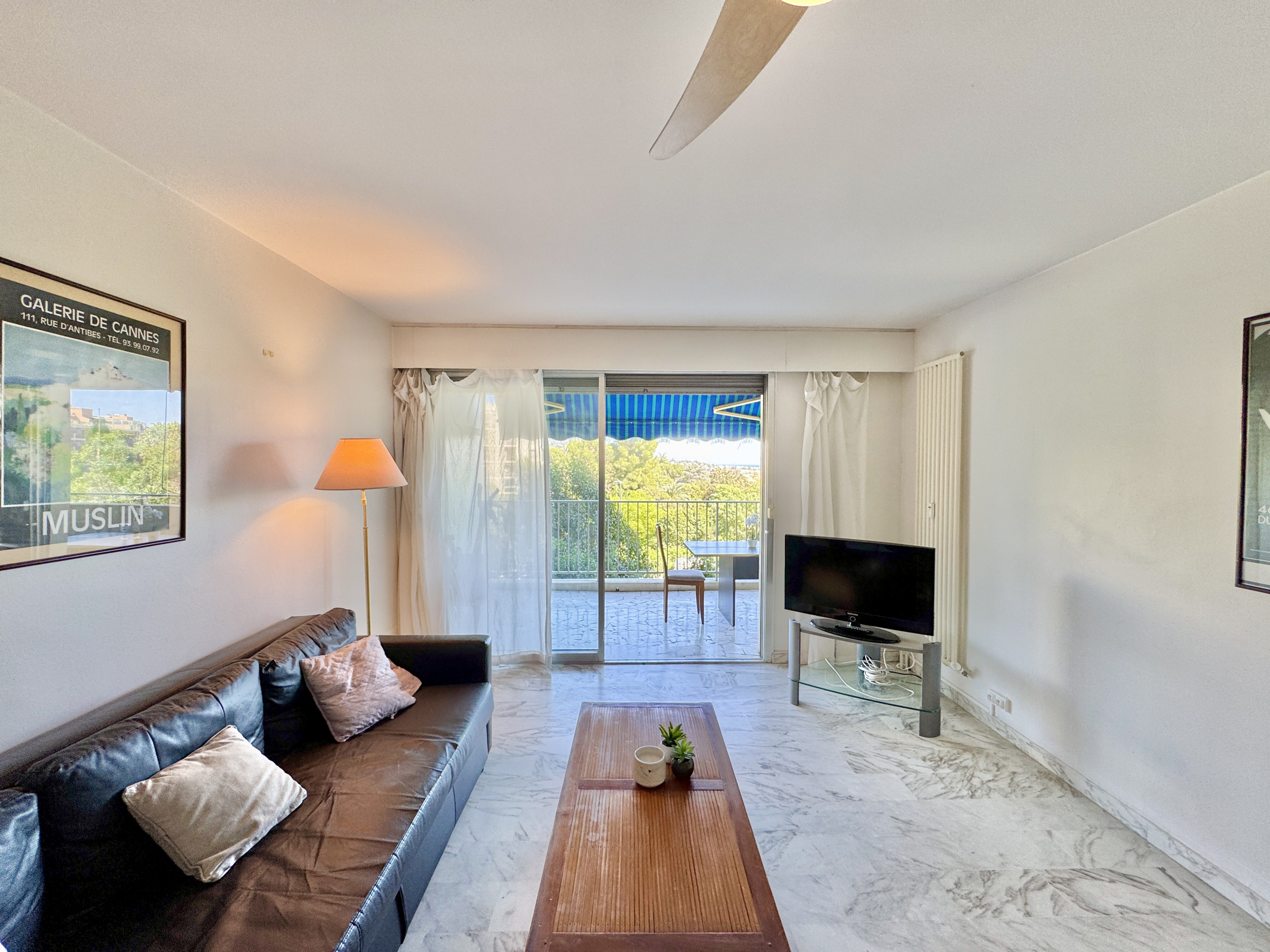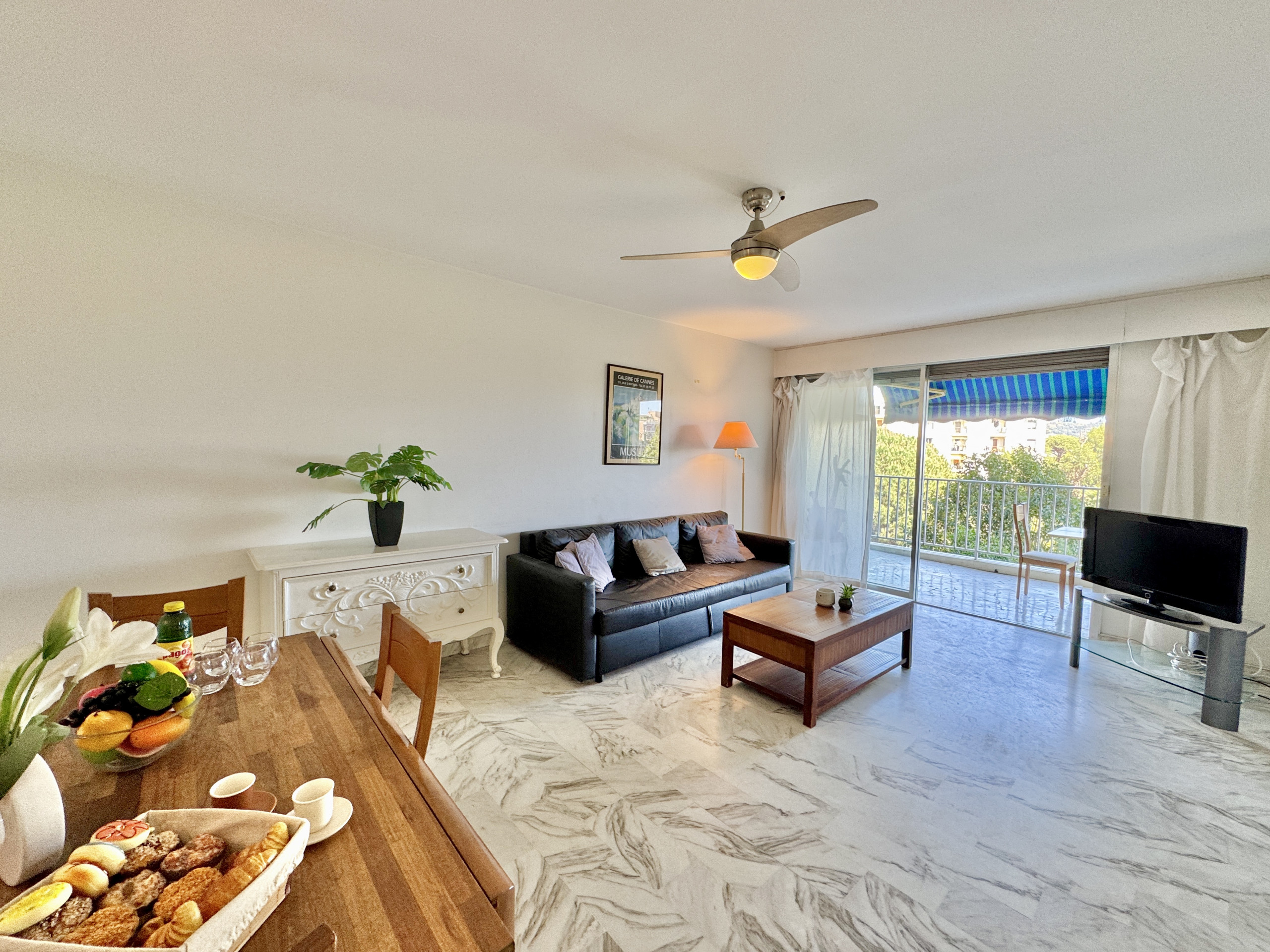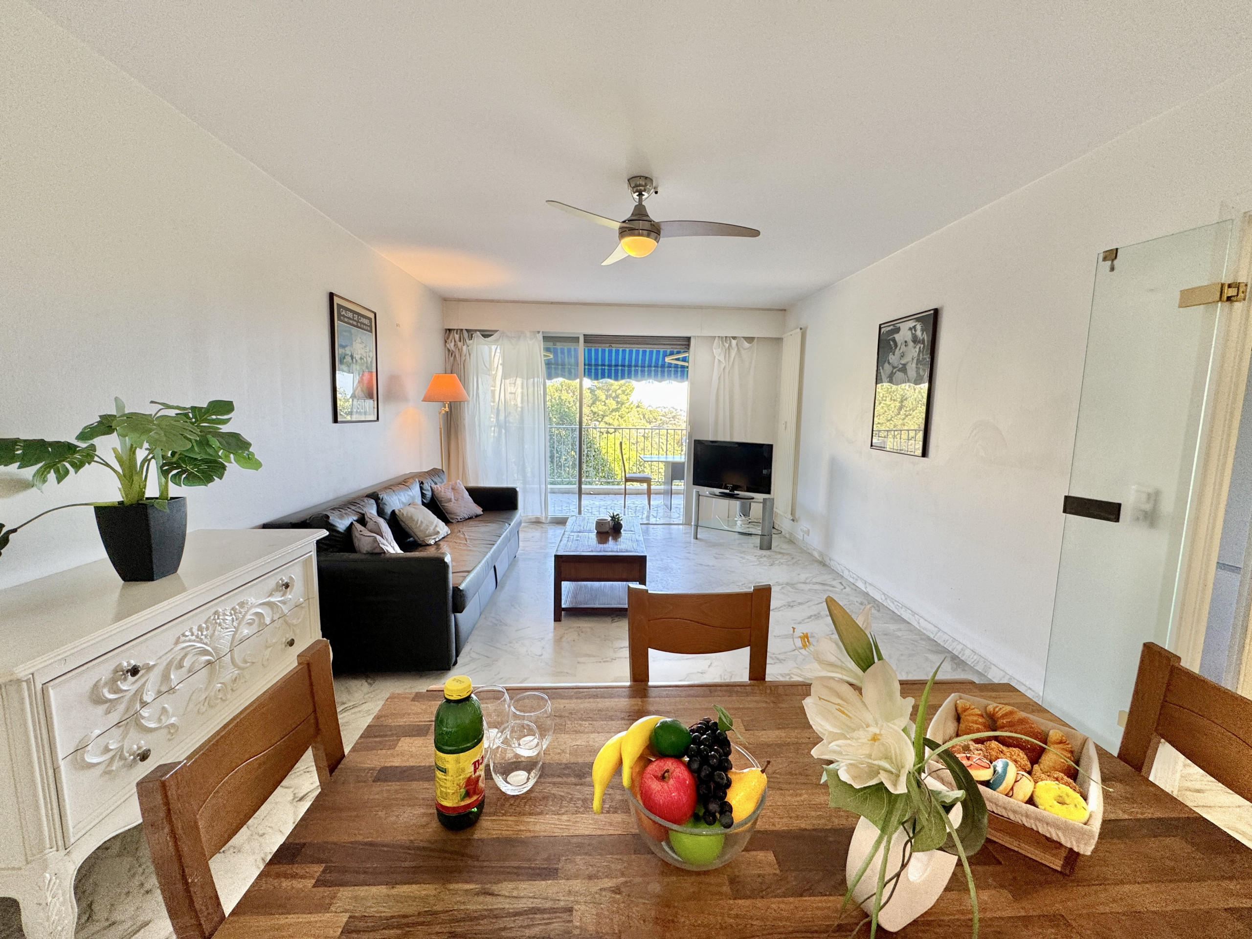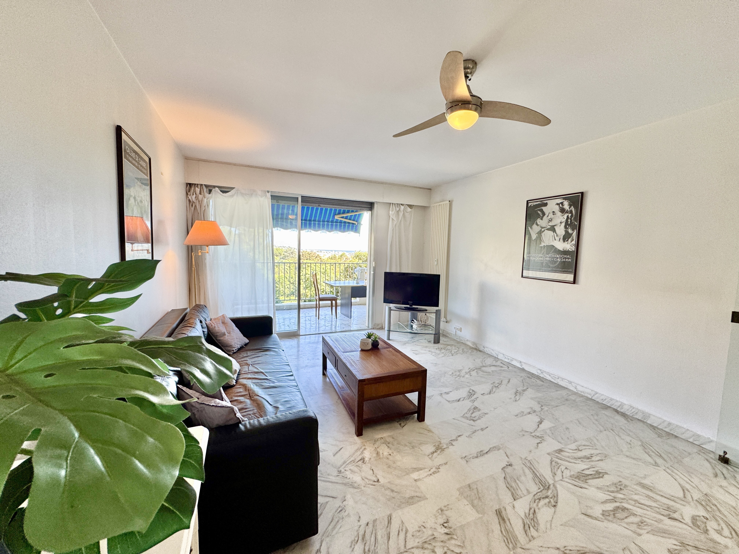 L'appartement bénéficie d'une belle luminosité naturelle, soulignée par un sol en marbre clair qui apporte une touche d'élégance à l'ensemble. Le séjour spacieux s'ouvre directement sur la terrasse par une large baie vitrée — un espace de vie agréable où il fait bon se retrouver en fin de journée, avec vue dégagée sur la verdure et un aperçu de la mer.
