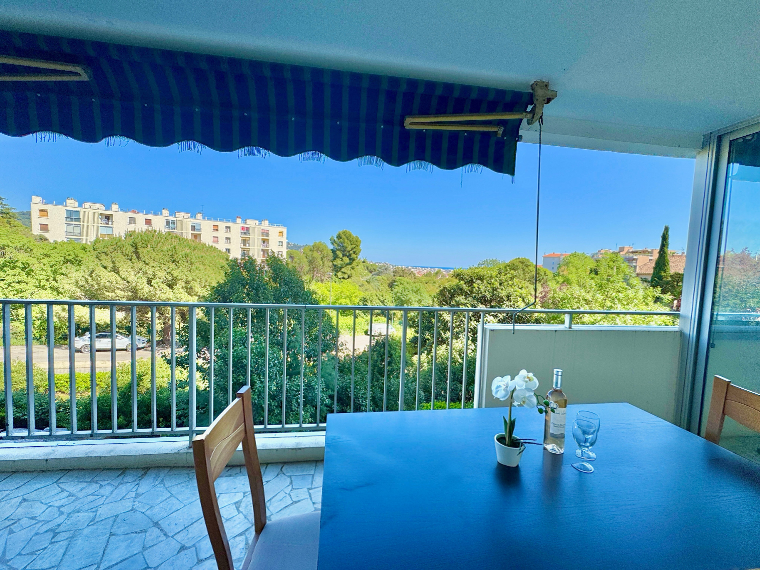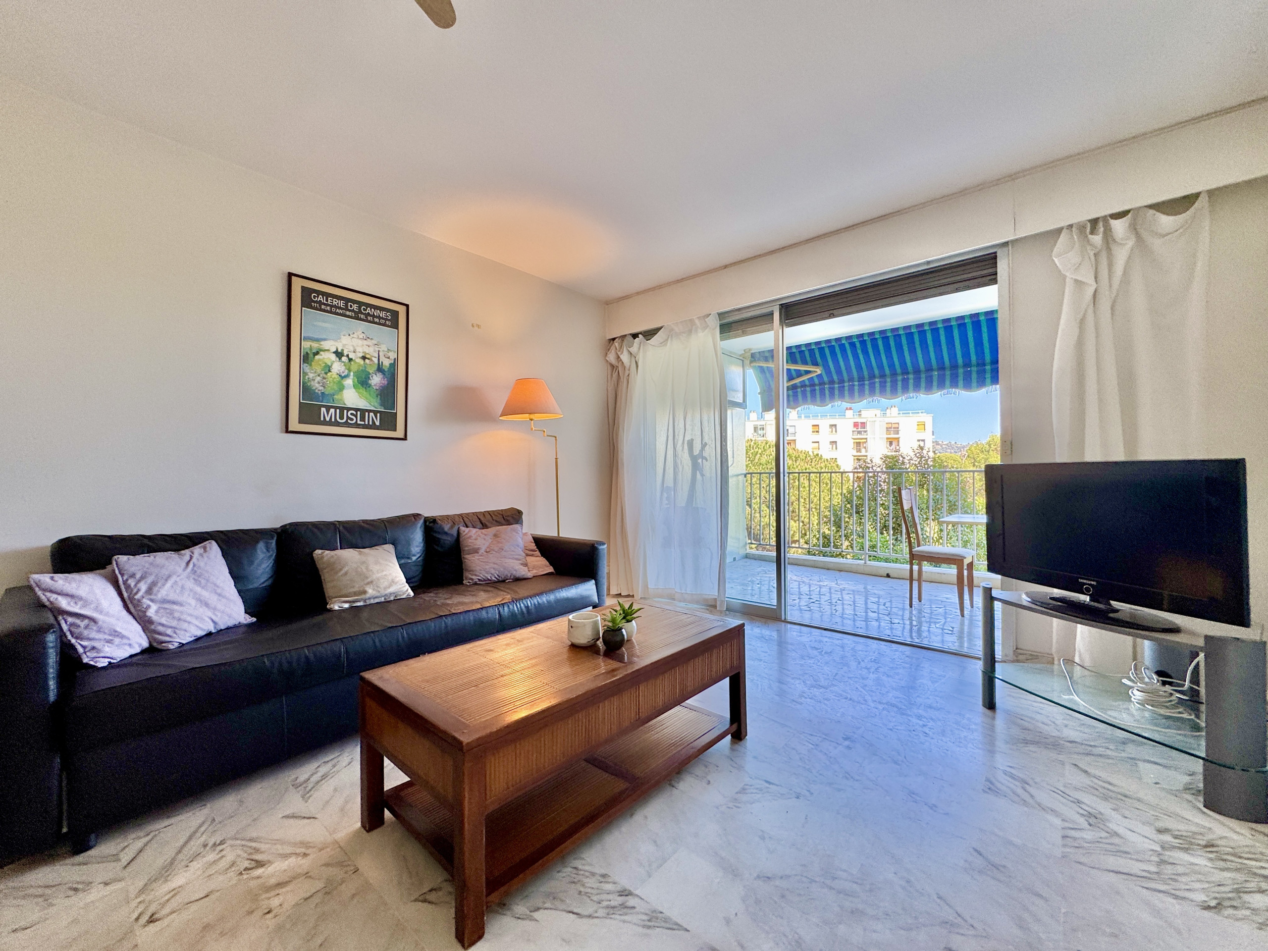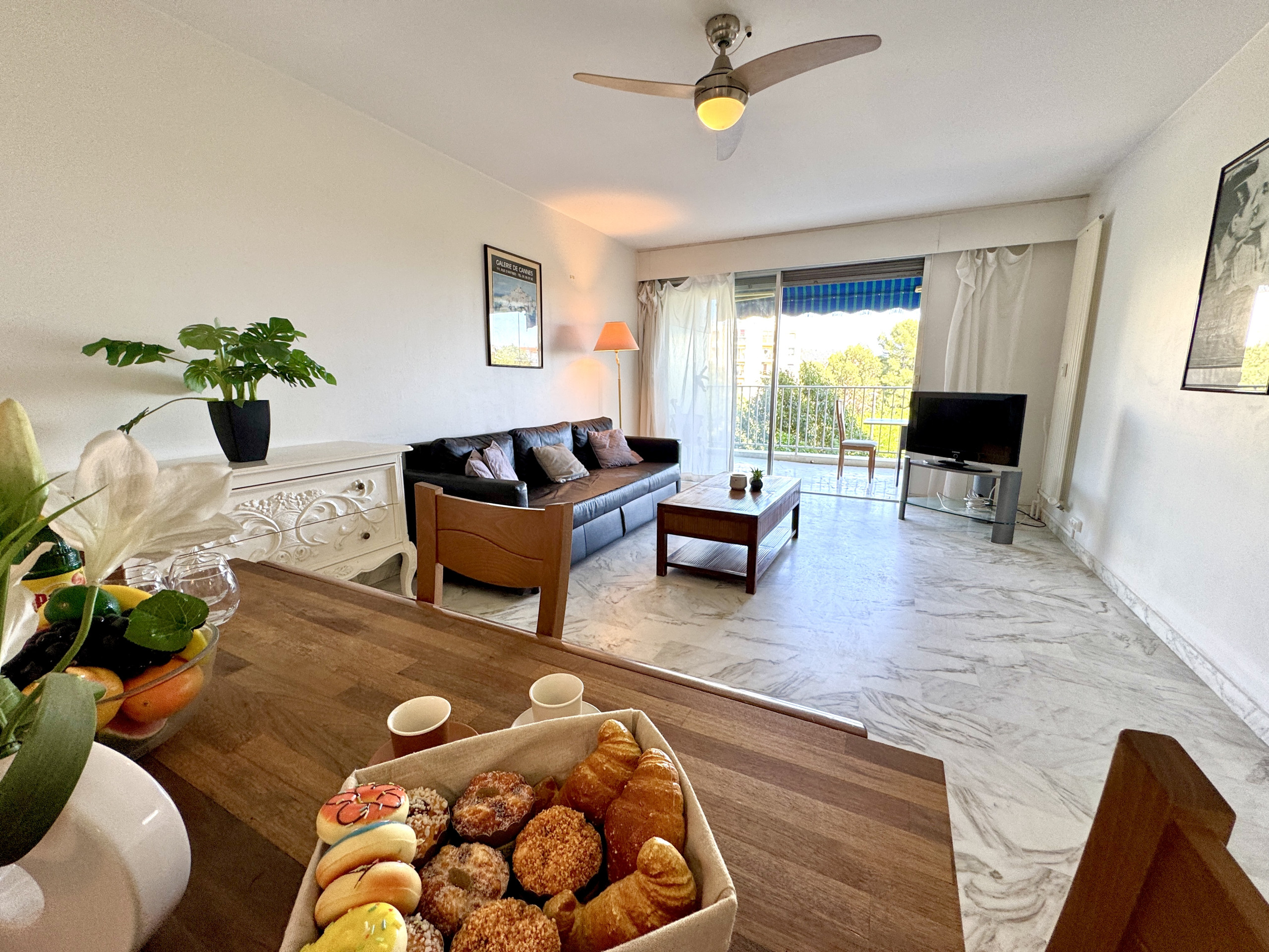 L'appartement bénéficie d'une belle luminosité naturelle, soulignée par un sol en marbre clair qui apporte une touche d'élégance à l'ensemble. Le séjour spacieux s'ouvre directement sur la terrasse par une large baie vitrée — un espace de vie agréable où il fait bon se retrouver en fin de journée, avec vue dégagée sur la verdure et un aperçu de la mer.