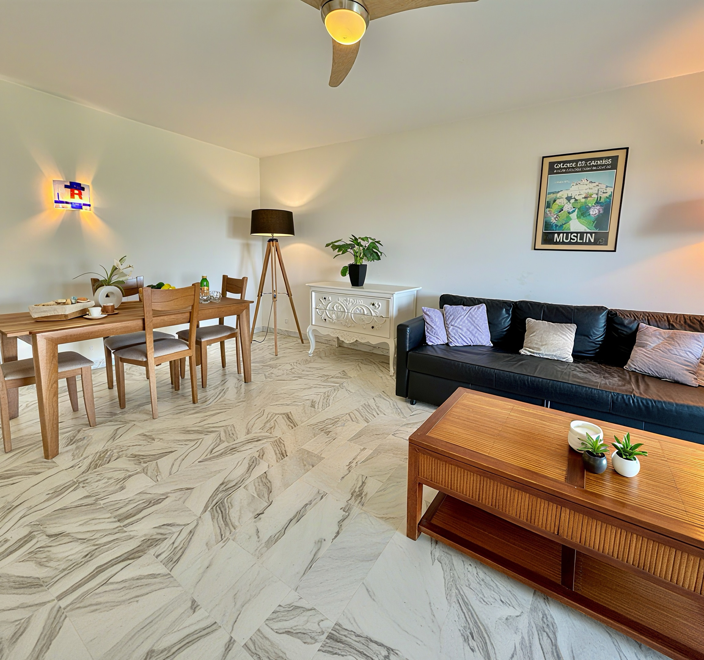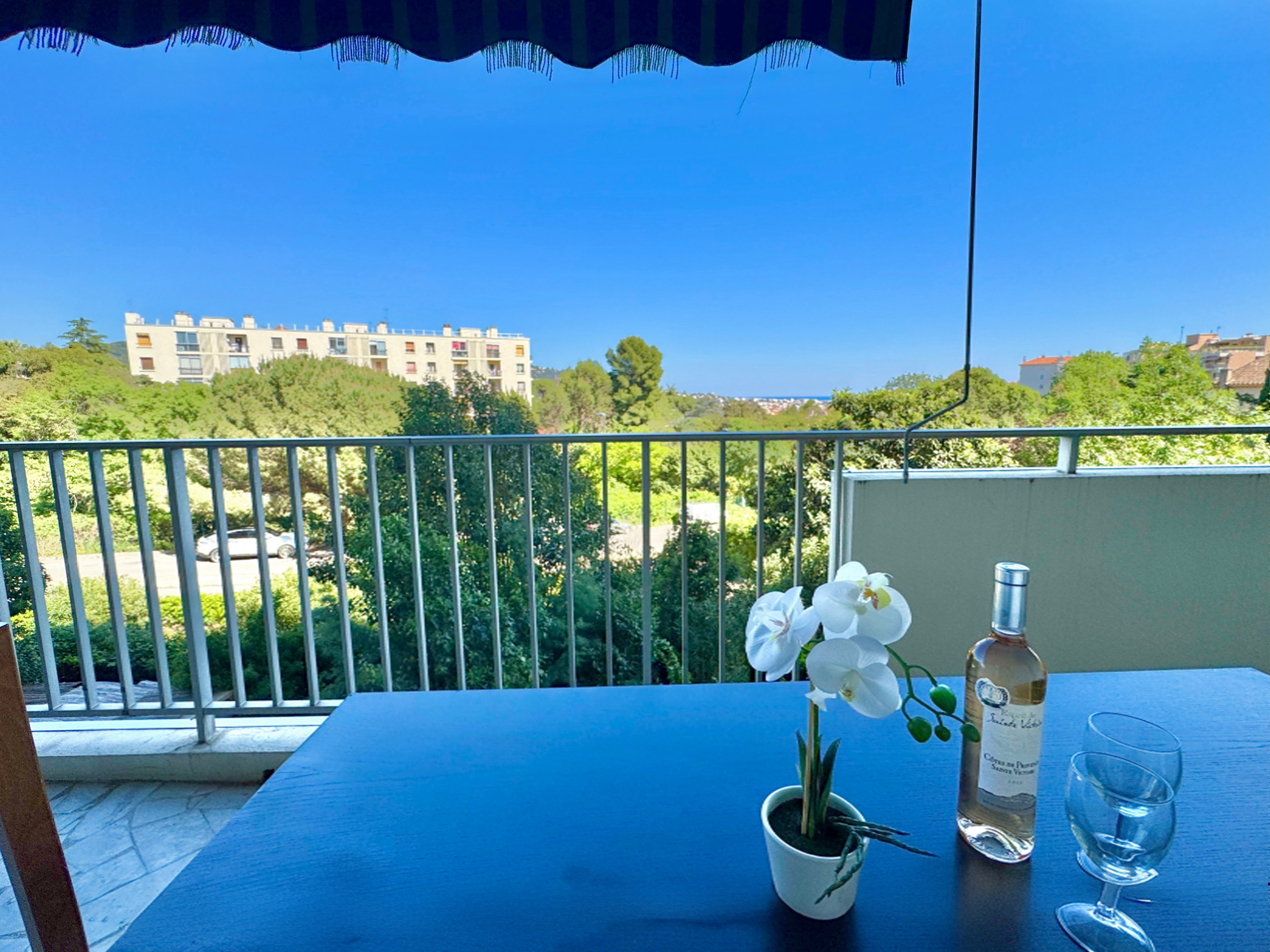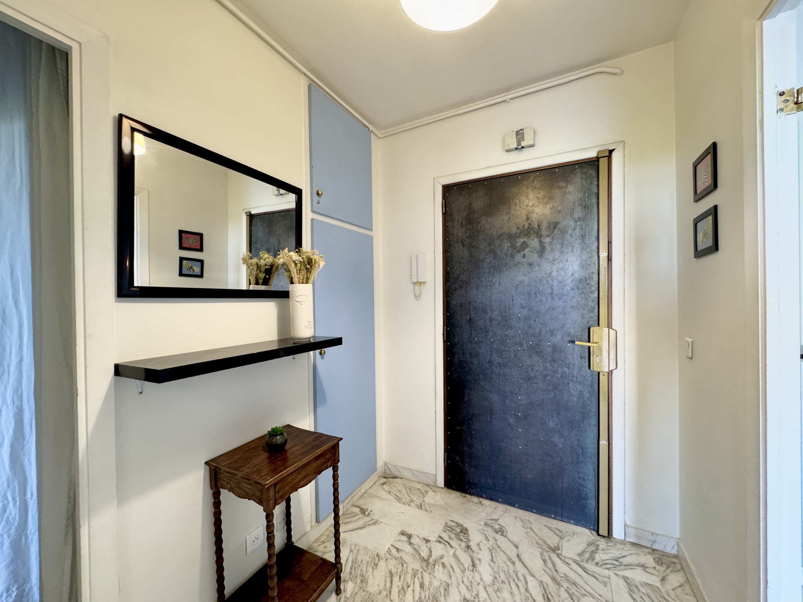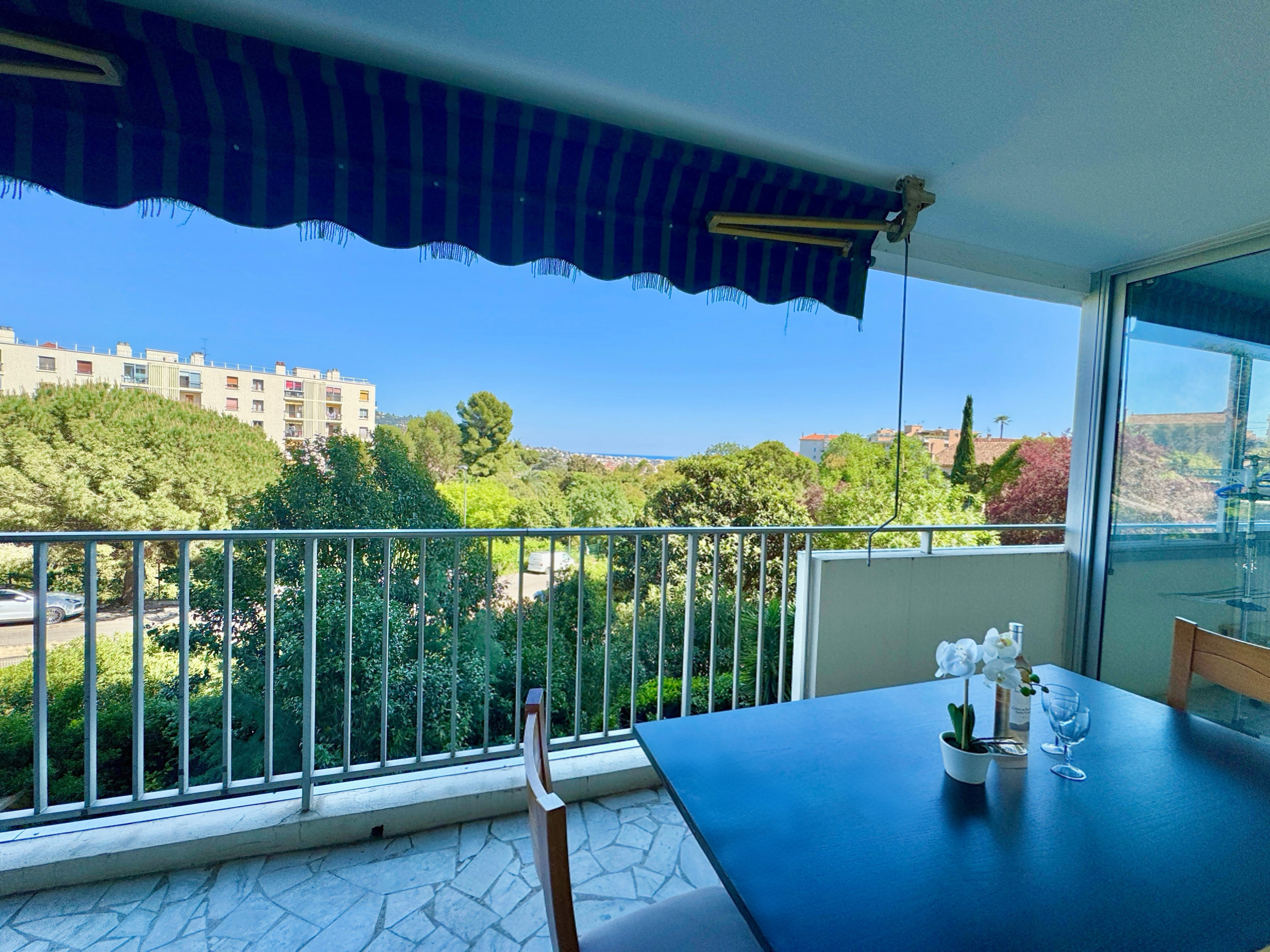 L'appartement bénéficie d'une belle luminosité naturelle, soulignée par un sol en marbre clair qui apporte une touche d'élégance à l'ensemble. Le séjour spacieux s'ouvre directement sur la terrasse par une large baie vitrée — un espace de vie agréable où il fait bon se retrouver en fin de journée, avec vue dégagée sur la verdure et un aperçu de la mer.
