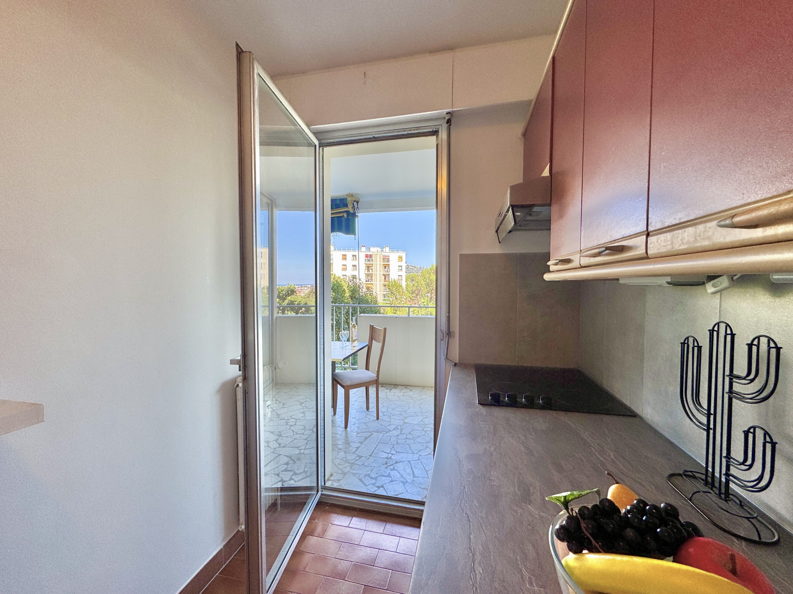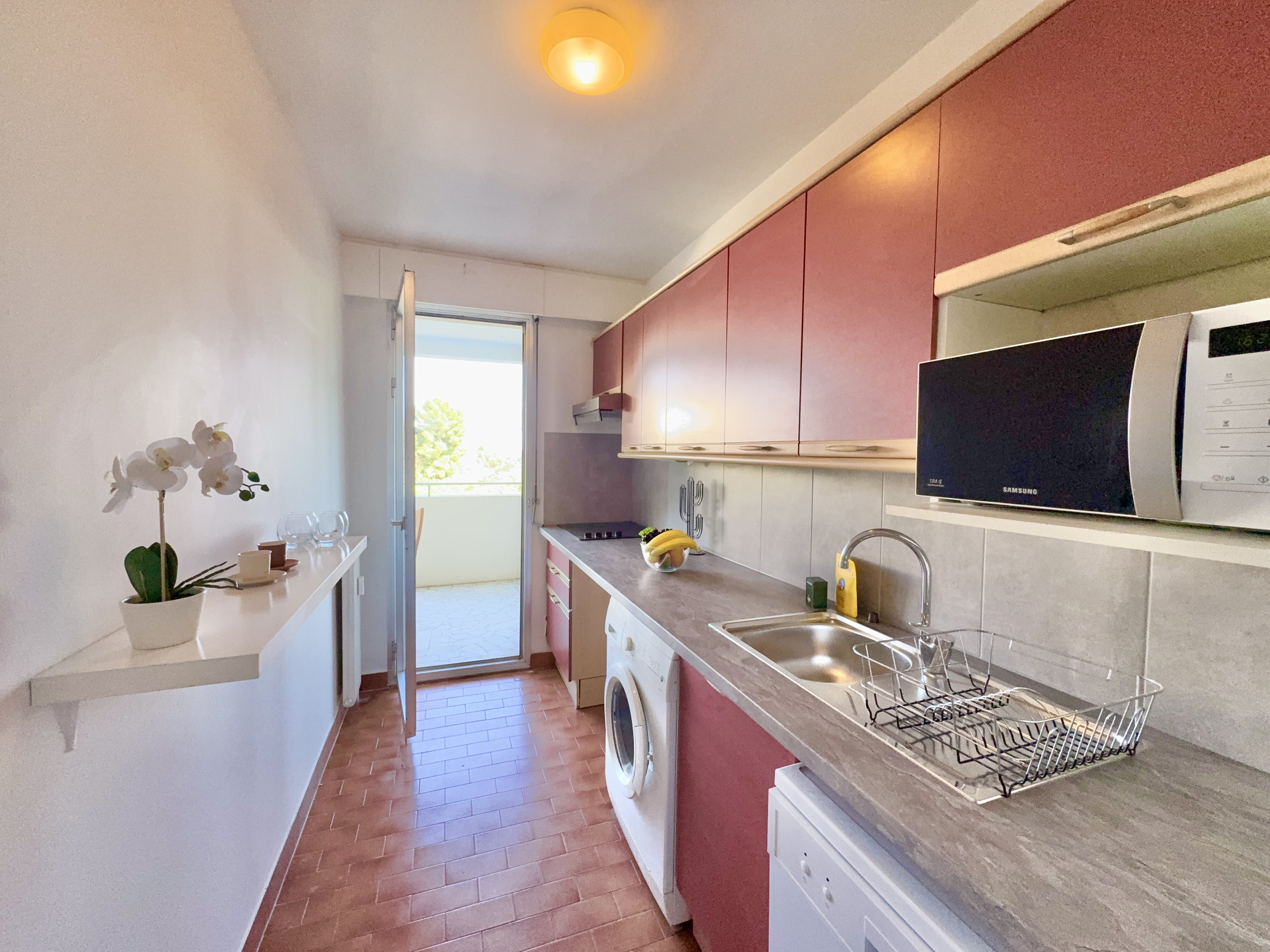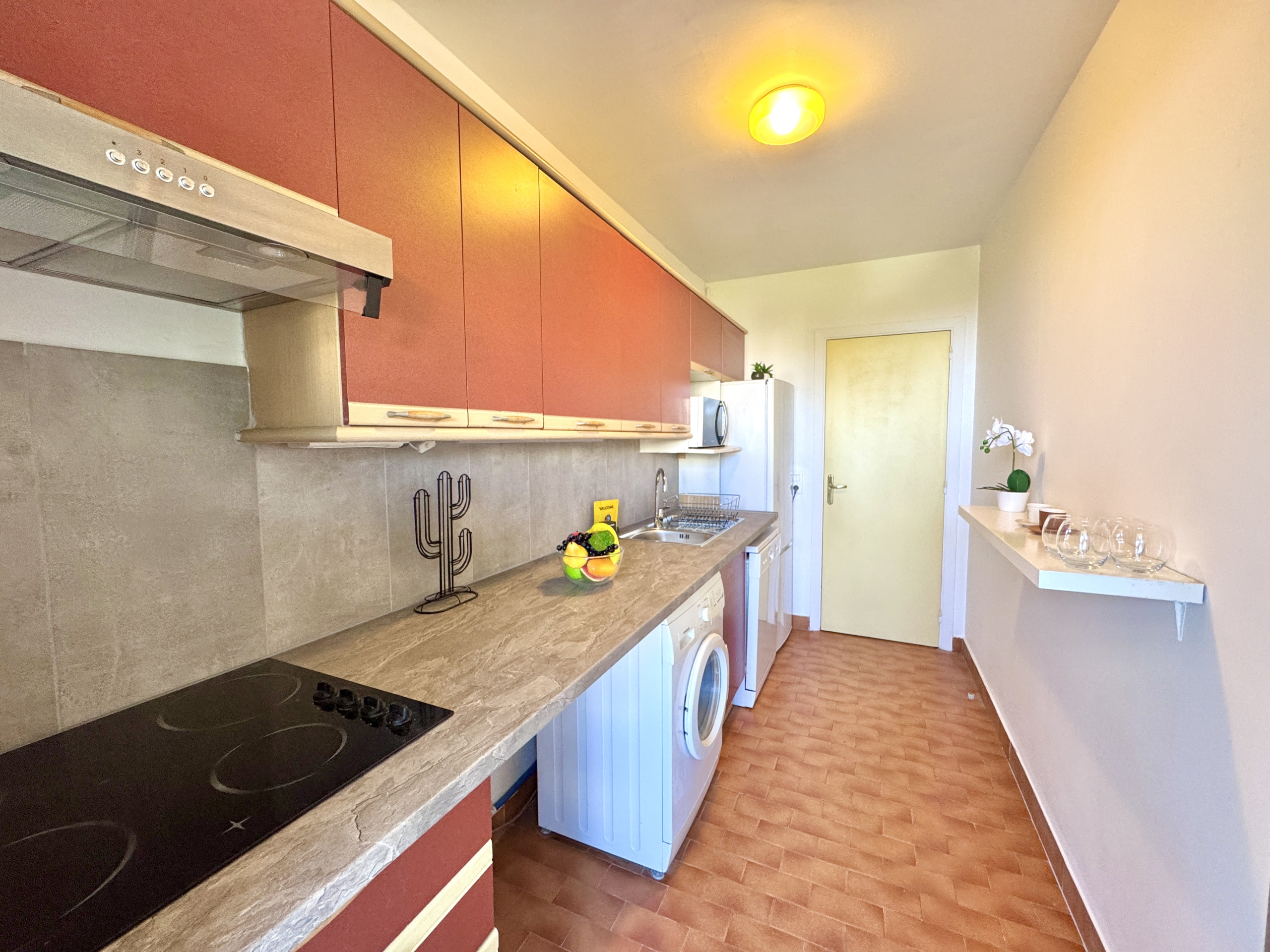 La cuisine séparée et entièrement équipée (lave-linge, micro-ondes, plaques de cuisson, lave-vaisselle) permet de profiter pleinement de l'appartement en toute autonomie, à l'image d'un véritable chez-soi à Cannes.