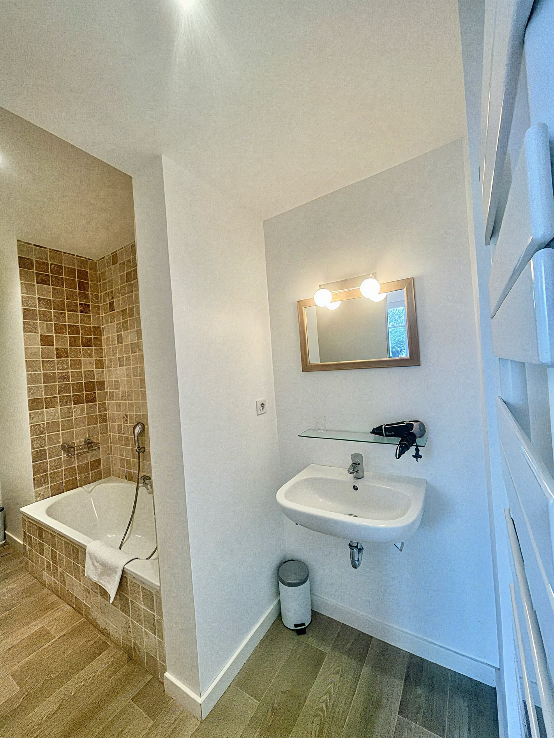L'appartement dispose de deux chambres confortables : une avec un lit double (160x190) et l'autre avec deux lits (90x190) ou un lit double (160x190), offrant une flexibilité d'hébergement pour répondre à vos besoins. La salle de bain est à la fois fonctionnelle et élégante, fournis avec un sèche cheveux et un WC séparé ajoute à la commodité.