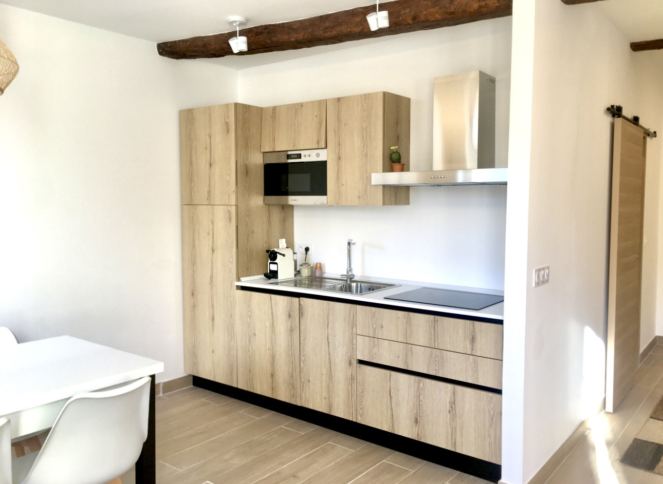 Le salon est lumineux et offre un canapé convertible avec un matelas de qualité, ainsi qu'une télévision. La cuisine ouverte est équipée d'un réfrigérateur, d'un four, d'une plaque électrique, d'une machine Nespresso et d'un lave-vaisselle. L'appartement comprend une chambre principale avec un lit double de 160, un placard, ainsi qu'une petite chambre avec un lit simple. La salle de bains est moderne avec une douche à l'italienne, des toilettes et un bidet.