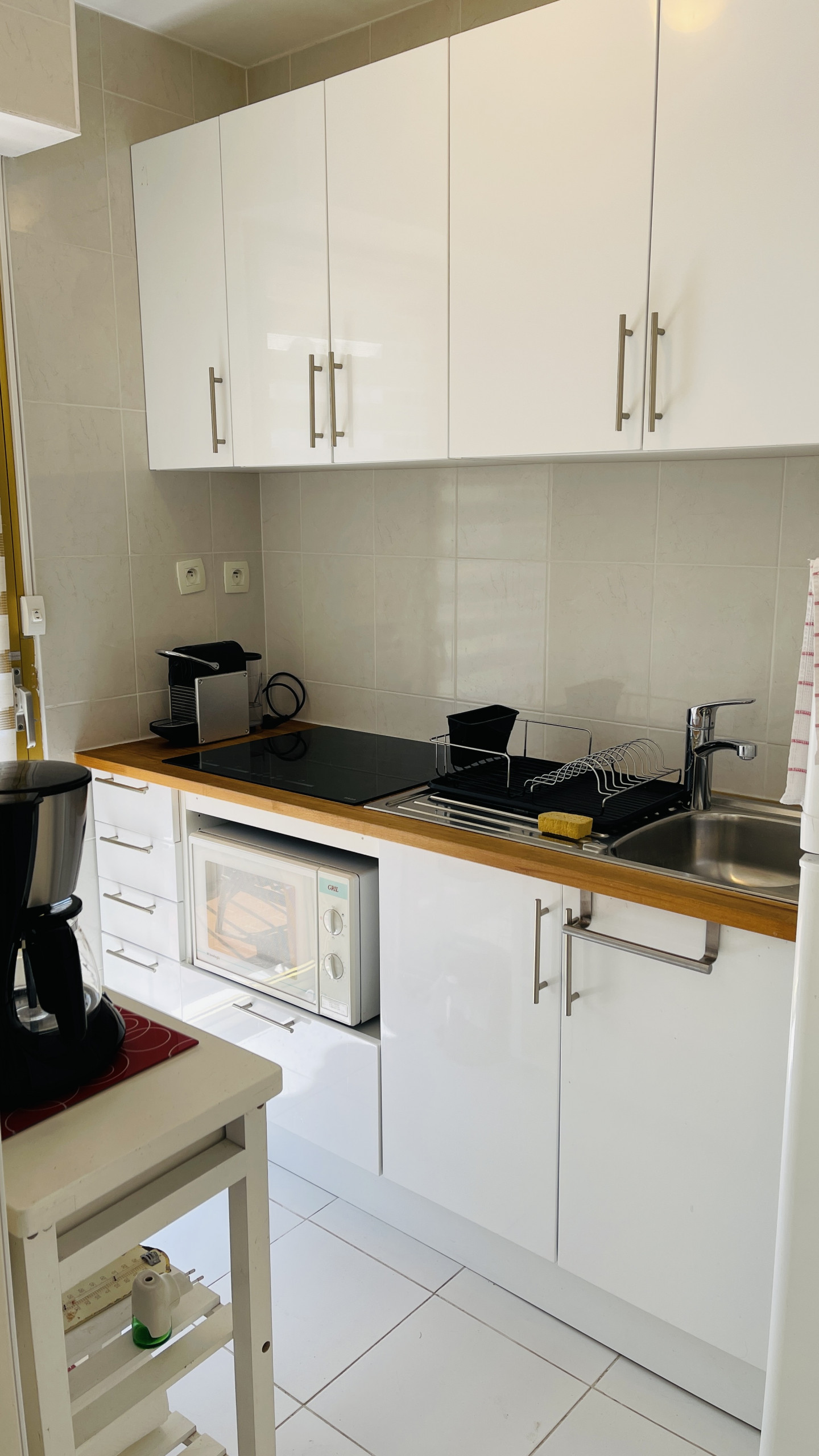 -La cuisine comprend réfrigérateur, four, micro-ondes, lave-vaisselle, cafetière filtre, cafetière Nespresso, grille-pain, bouilloire, presse-agrume, ainsi que tous les ustensiles nécessaires pour préparer vos repas. Elle est intégrée de manière discrète avec un mange-debout favorisant ainsi une utilisation optimale de l'espace.