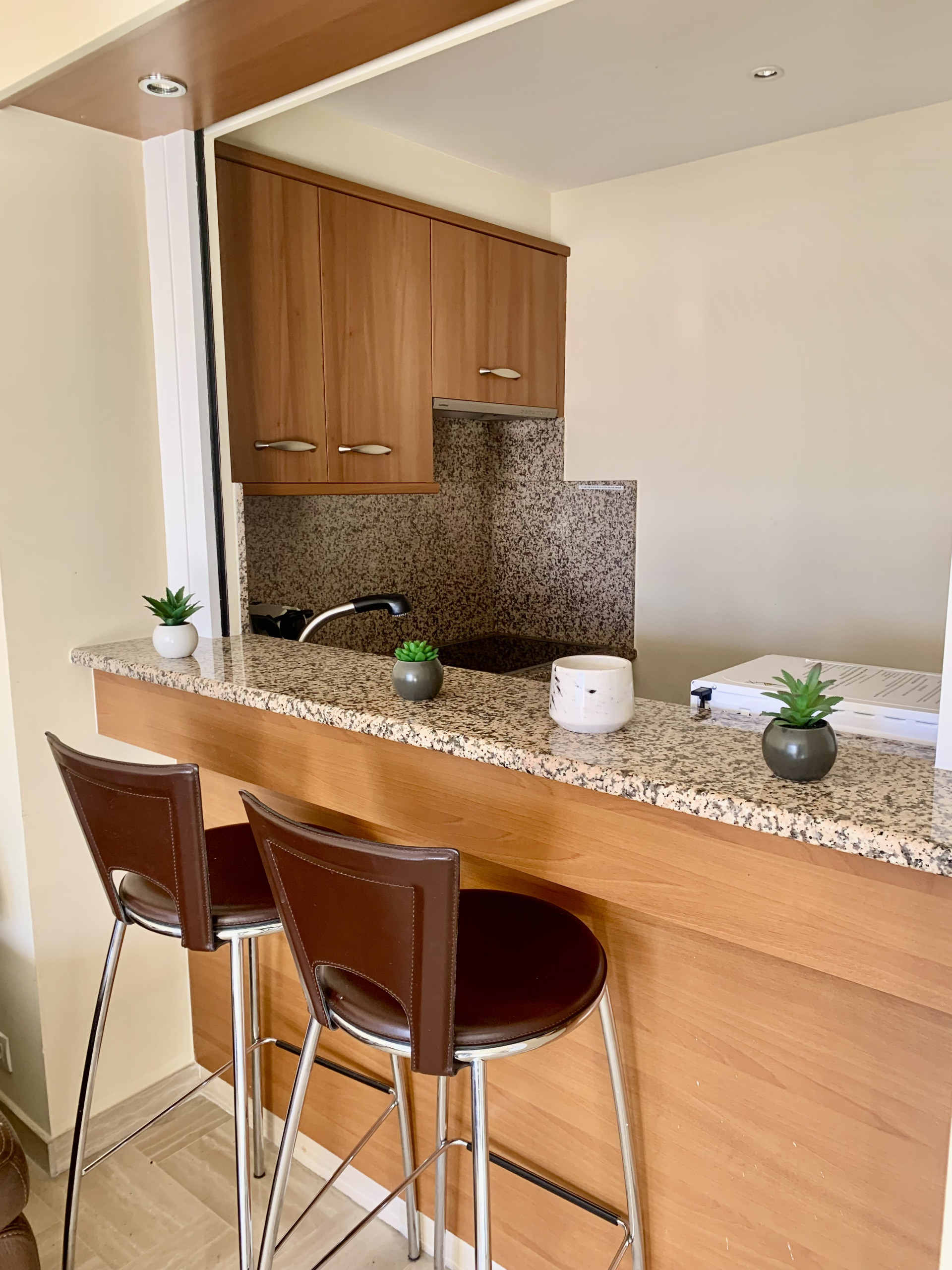 En entrant dans le couloir, vous trouverez le coin cuisine avec une plaque électrique 2 feux, un micro-onde, un réfrigérateur, lave vaisselle, une cafetière Nespresso et une bouilloire. Puis la salle de bains avec wc, sèche serviettes et sèche cheveux