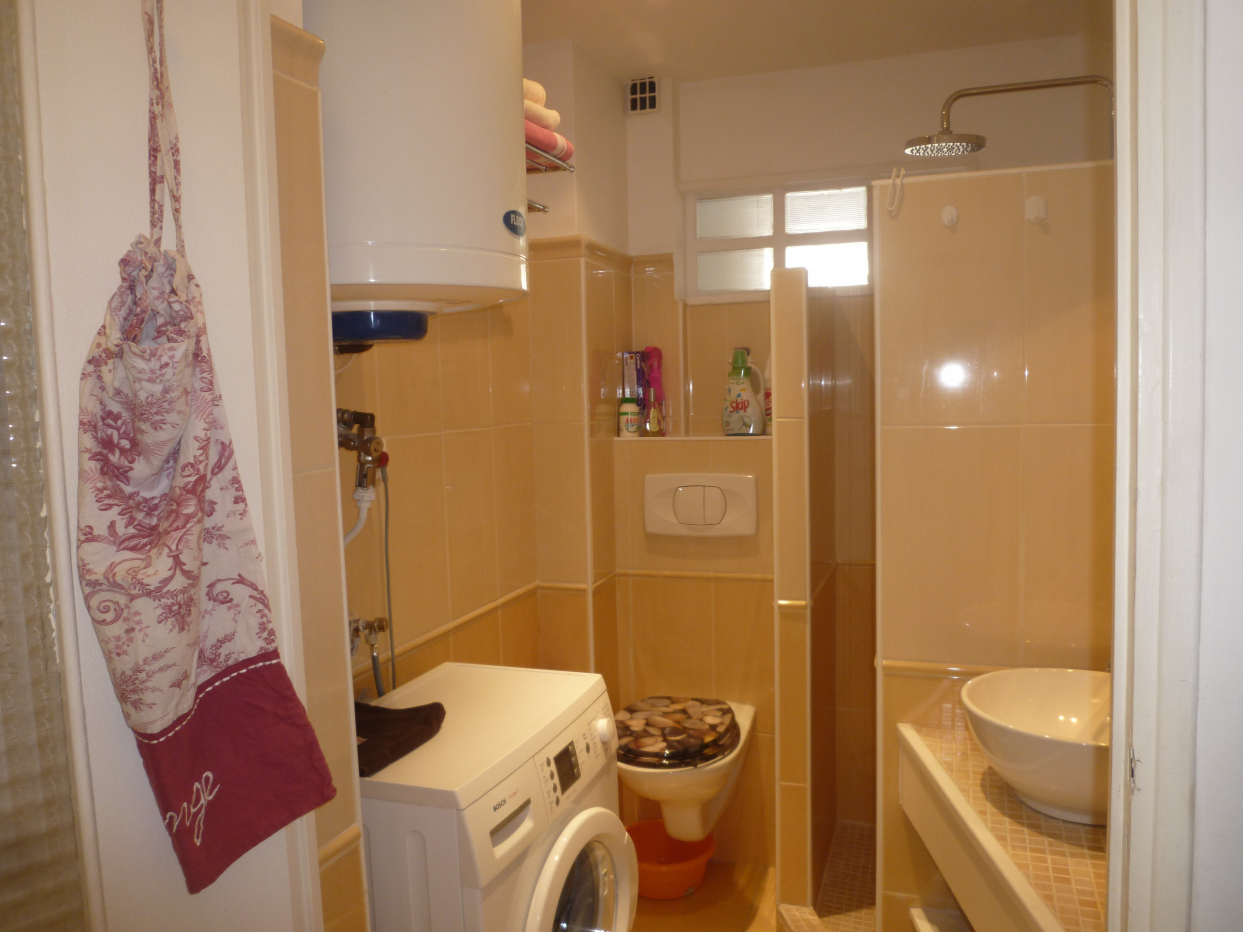 Grande salle de douche lumineuse avec WC, fenêtre, sèche cheveux, lave linge