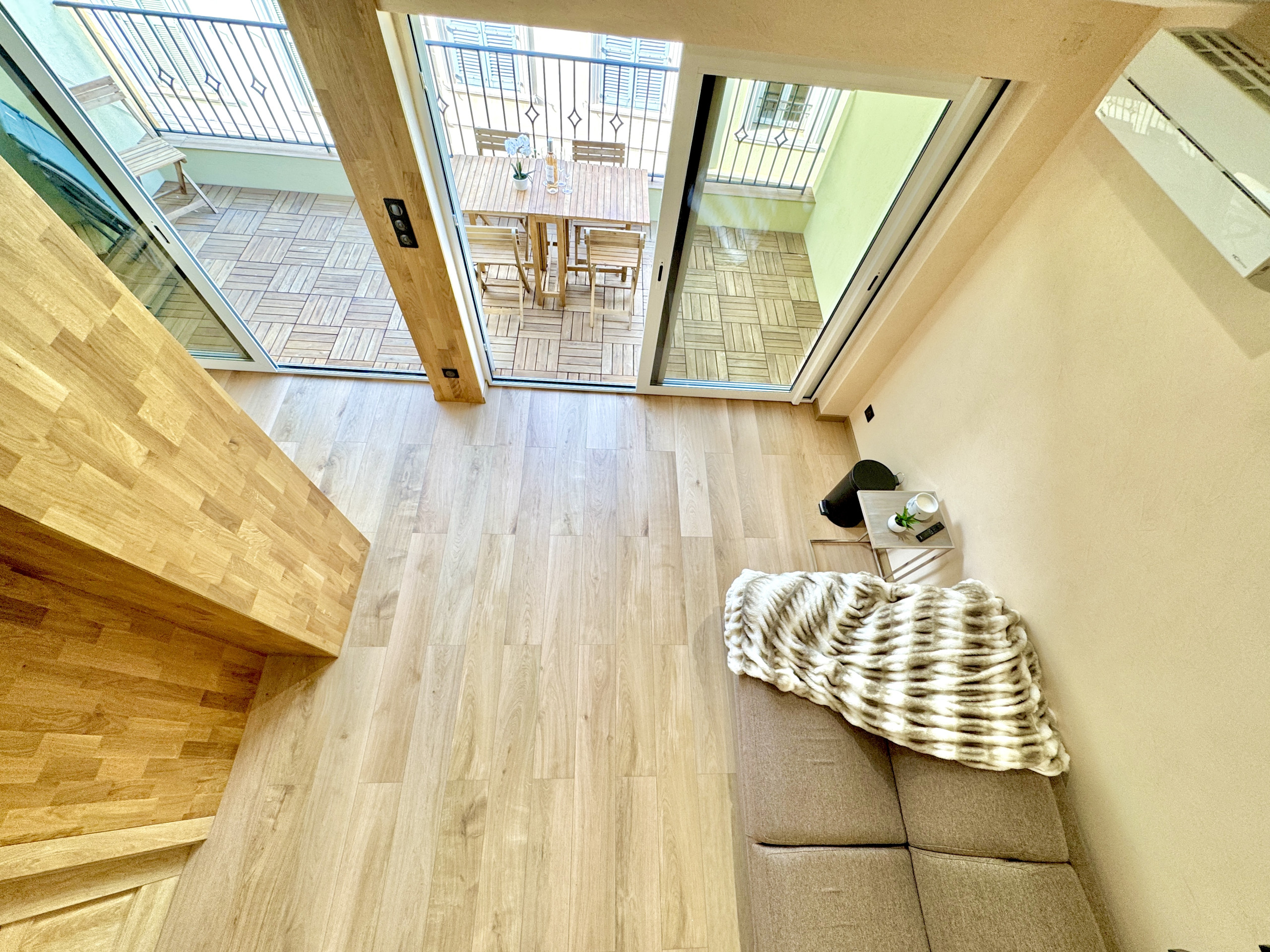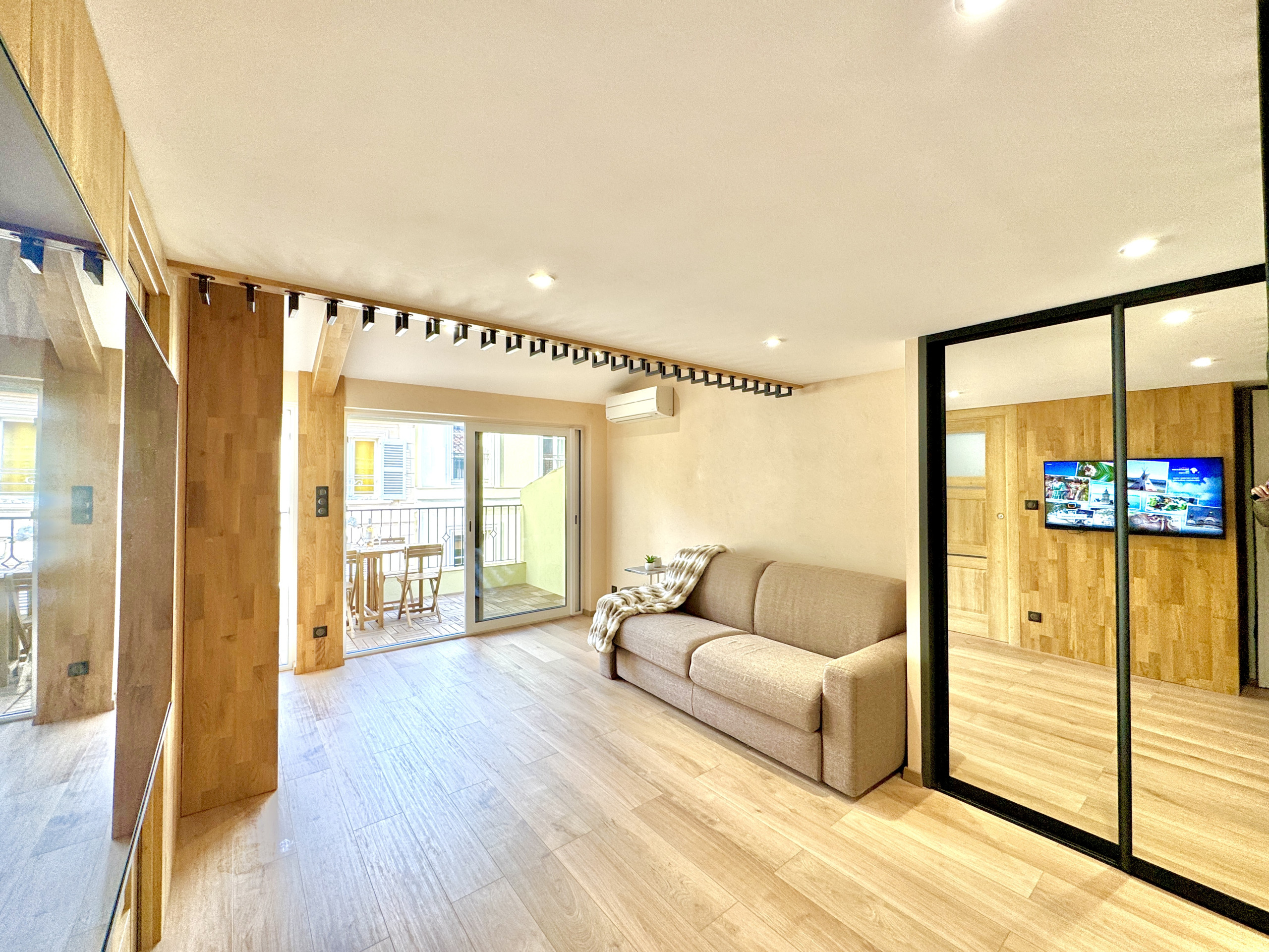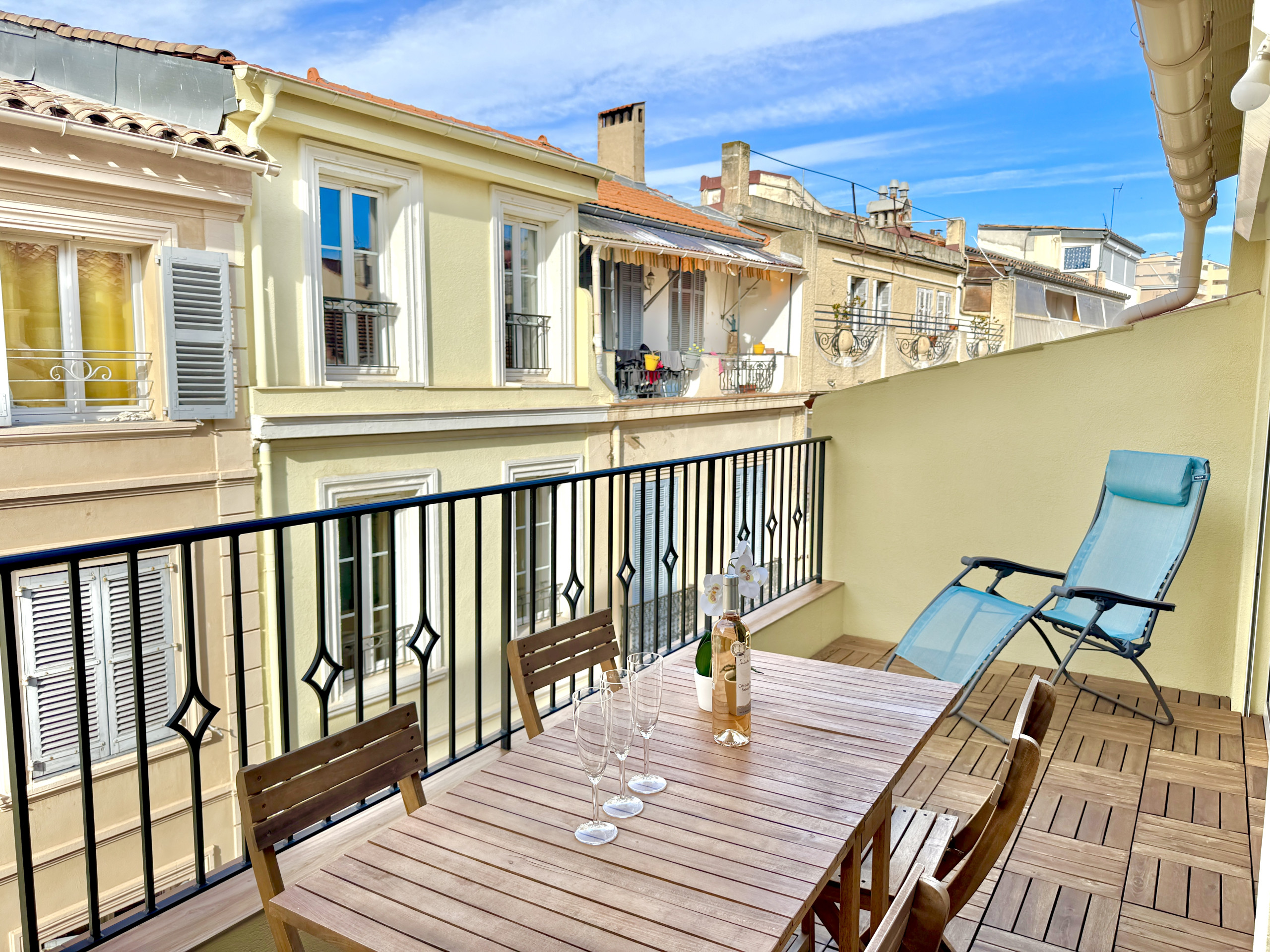 Appartement type studio d'environ 42m2 avec belle terrasse au troisième étage sans ascenseur d'un petit immeuble de ville privé situé au centre de Cannes.