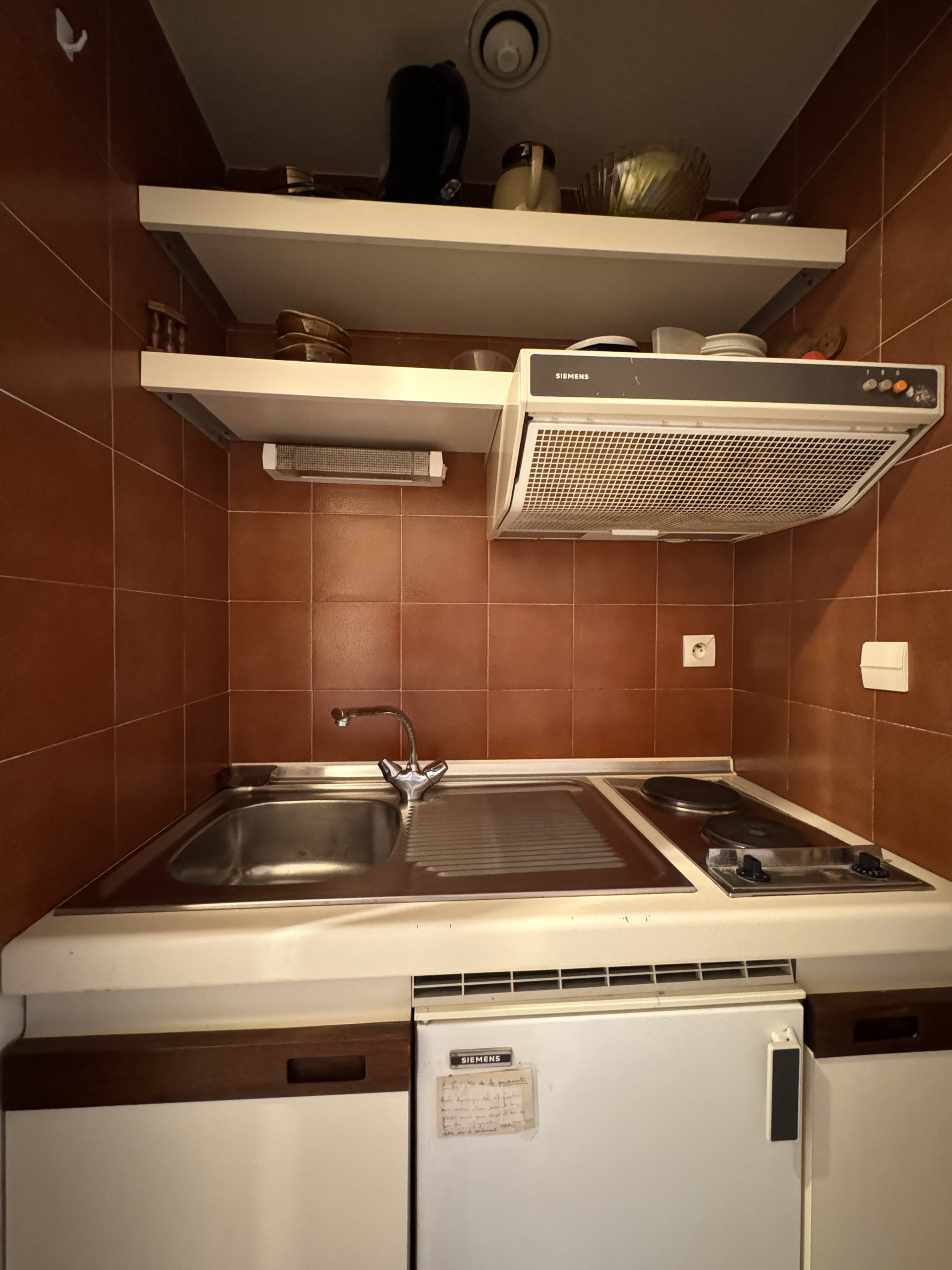 La partie cuisine est entièrement équipée avec un réfrigérateur, un four micro-ondes, une plaque électrique, une cafetière Nespresso, une bouilloire. La salle de douche avec WC est équipée d'un lave-linge pour plus de commodité.