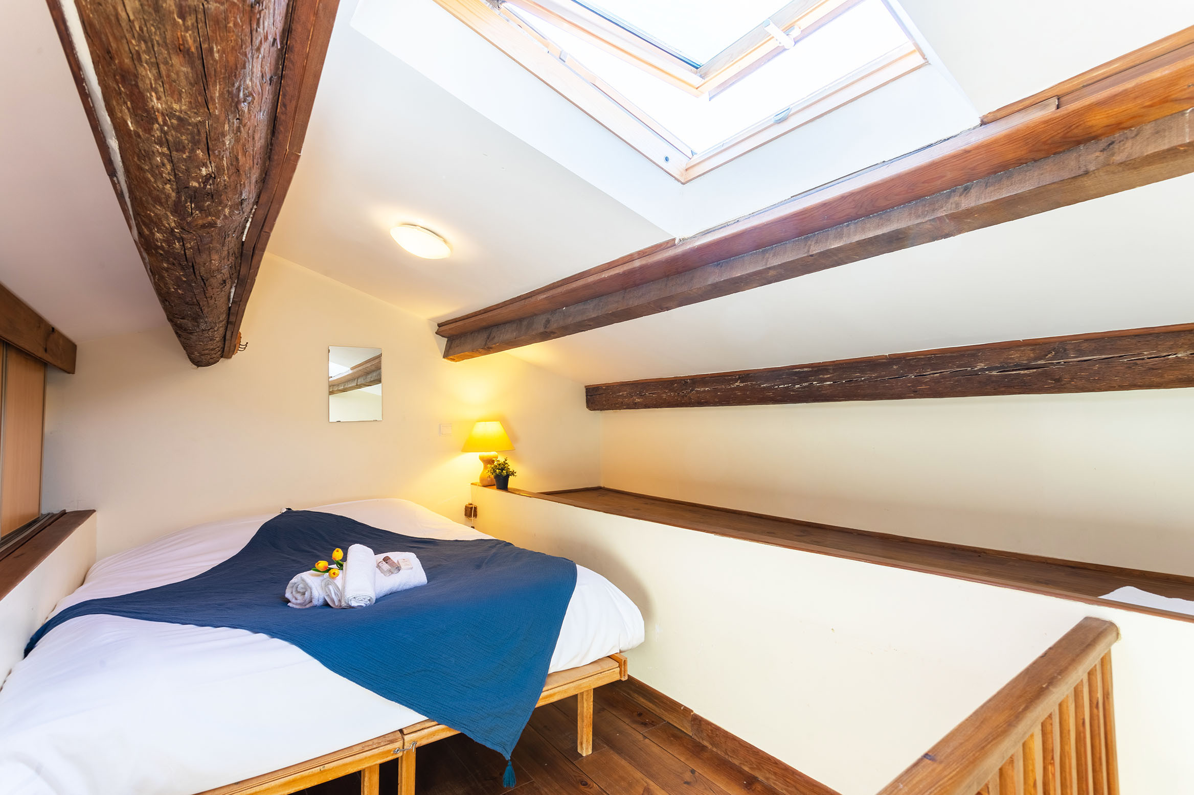 Il comprend une petite cuisine équipée, un espace de couchage au 1er étage avec 1 lit double (140 cm), un salon avec une zone repas et un canapé-lit pour 2 personnes, une salle de bain avec douche et toilettes.